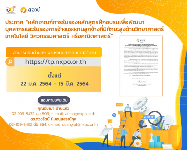 สามารถยื่นเอกสารขอรับรองหลักสูตรฝึกอบรม และเอกสารขอรับรองการจ้างงานบุคลากรตำแหน่งงานทักษะสูง ผ่านระบบสารสนเทศได้ทาง https://tp.nxpo.or.th ตั้งแต่ 22 ม.ค. 2564 – 15 มี.ค. 2564
