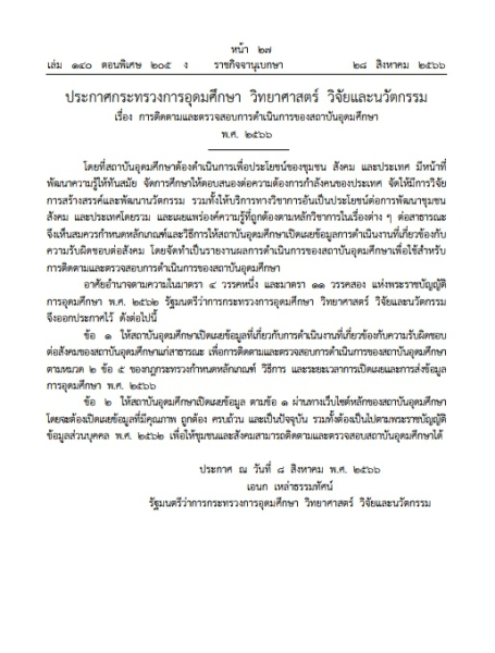 ประกาศกระทรวง เรื่อง การติดตาม และตรวจสอบการดำเนินการ ของสถาบันอุดมศึกษา พ.ศ. 2566