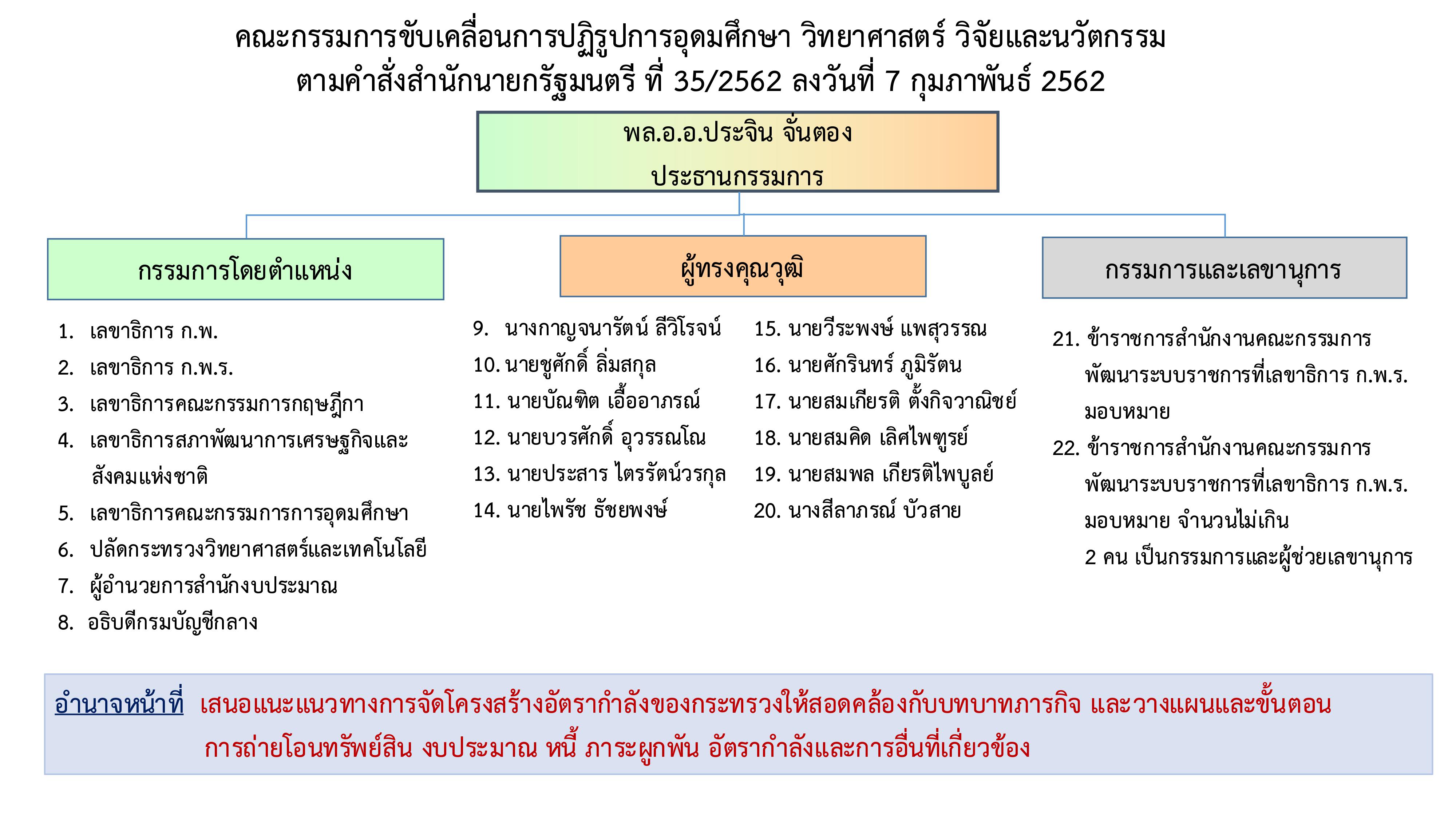 • คำสั่งคณะกรรมการขับเคลื่อนการปฏิรูปการอุดมศึกษา วิทยาศาสตร์ วิจัยและนวัตกรรม ที่ 1/2562 เรื่อง แต่งตั้งคณะทำงานกำกับการจัดโครงสร้างและอัตรากำลังของหน่วยงานในสังกัดกระทรวงการอุดมศึกษา วิทยาศาสตร์ วิจัยและนวัตกรรม เพื่อทำหน้าที่ให้ข้อเสนอแนะในการจัดโครงสร้างและอัตรากำลังของส่วนราชการและองค์การมหาชนในสังกัดกระทรวงฯ เพื่อนำเสนอต่อคณะกรรมการขับเคลื่อนการปฏิรูปฯ เพื่อพิจารณา รวมถึงให้คำปรึกษา แนะนำเกี่ยวกับการบรรจุ การย้าย การโอน การเกลี่ยอัตรากำลังของส่วนราชการในสังกัดกระทรวงฯ รวมถึง สอวช. และ สกสว. ตลอดจน ให้คำปรึกษา แนะนำเกี่ยวกับแนวทางการคัดเลือกข้าราชการ เพื่อบรรจุและแต่งตั้งเป็นพนักงานของ สอวช. และ สกสว.
