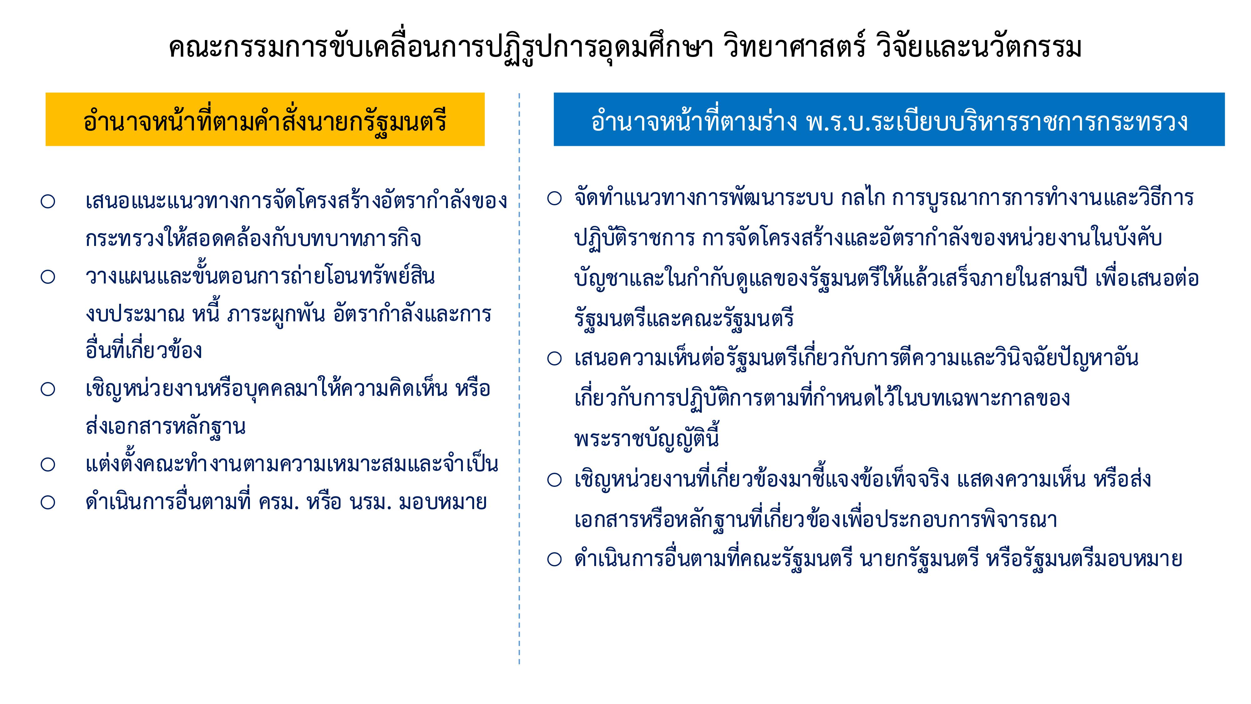 • คำสั่งคณะกรรมการขับเคลื่อนการปฏิรูปการอุดมศึกษา วิทยาศาสตร์ วิจัยและนวัตกรรม ที่ 3/2562 เรื่อง แต่งตั้งคณะทำงานพัฒนาระบบและแนวทางการเพิ่มประสิทธิภาพกระทรวงการอุดมศึกษา วิทยาศาสตร์ วิจัยและนวัตกรรม เพื่อทำหน้าที่จัดทำร่างกรอบนโยบาย ยุทธศาสตร์ แผนด้านการอุดมศึกษา และแผนด้านวิทยาศาสตร์ วิจัยและนวัตกรรมของประเทศ รวมทั้งร่างแนวทางการจัดสรรและบริหารงบประมาณด้านการอุดมศึกษา และด้านวิทยาศาสตร์ วิจัย และนวัตกรรมให้เป็นไปตามเจตนารมณ์ของพระราชบัญญัติสภานโยบายการอุดมศึกษา วิทยาศาสตร์ วิจัยและนวัตกรรมฯ เพื่อให้สำนักงานสภานโยบายการอุดมศึกษา วิทยาศาสตร์ วิจัยและนวัตกรรมแห่งชาติ (สอวช.) นำไปใช้เป็นแนวทางในการดำเนินการต่อไป ตลอดจน จัดทำประเด็นการปฏิรูปที่สำคัญด้านการอุดมศึกษา วิทยาศาสตร์ วิจัยและนวัตกรรม เพื่อส่งมอบให้คณะกรรมการส่งเสริมวิทยาศาสตร์ วิจัยและนวัตกรรม (กสว.) คณะกรรมการการอุดมศึกษา (กกอ.) และคณะกรรมการมาตรฐานการอุดมศึกษา (กมอ.) ใช้ในการขับเคลื่อนต่อไป