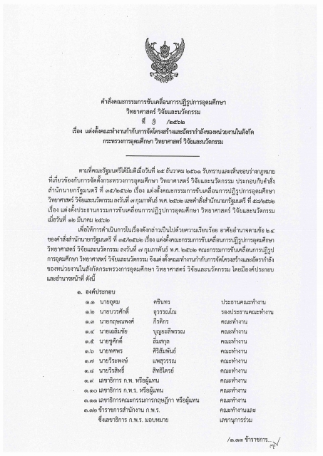 เรื่อง แต่งตั้งคณะทำงานกำกับการจัดโครงสร้างและอัตรากำลังของหน่วยงานในสังกัดกระทรวงการอุดมศึกษา วิทยาศาสตร์ วิจัยและนวัตกรรม เพื่อทำหน้าที่ให้ข้อเสนอแนะในการจัดโครงสร้างและอัตรากำลังของส่วนราชการและองค์การมหาชนในสังกัดกระทรวงฯ เพื่อนำเสนอต่อคณะกรรมการขับเคลื่อนการปฏิรูปฯ เพื่อพิจารณา รวมถึงให้คำปรึกษา แนะนำเกี่ยวกับการบรรจุ การย้าย การโอน การเกลี่ยอัตรากำลังของส่วนราชการในสังกัดกระทรวงฯ รวมถึง สอวช. และ สกสว. ตลอดจน ให้คำปรึกษา แนะนำเกี่ยวกับแนวทางการคัดเลือกข้าราชการ เพื่อบรรจุและแต่งตั้งเป็นพนักงานของ สอวช. และ สกสว.