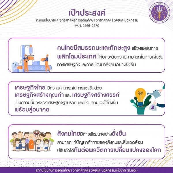 เป็นหน่วยงานของรัฐที่จัดตั้งขึ้นเพื่อขับเคลื่อนการอุดมศึกษาไทย วิทยาศาสตร์ วิจัยและนวัตกรรม ไปสู่มาตรฐานในระดับสากล และเพิ่มอันดับความสามารถการแข่งขันในระดับนานาชาติอย่างยั่งยืน ไม่ได้มีวัตถุประสงค์เพื่อแสวงหากำไร หากท่านพบว่ามีข้อมูลใดๆ ที่ละเมิดทรัพย์สินทางปัญญาปรากฏอยู่ในเว็บไซต์นี้ โปรดแจ้งให้ทราบ เพื่อดำเนินการแก้ปัญหาดังกล่าวโดยเร็วที่สุดต่อไป