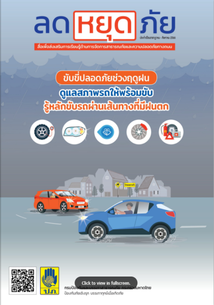 จุลสารลด - หยุด - ภัย ฉบับประจำเดือนกรกฎาคม - สิงหาคม 2566 เรื่อง "ขับขี่ปลอดภัยช่วงฤดูฝน ดูแลสภาพรถให้พร้อมขับ รู้หลักขับรถผ่านเส้นทางที่มีฝนตก"