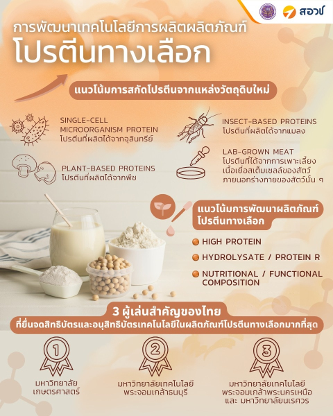 ส่วนตัวอย่างแนวโน้มการพัฒนาผลิตภัณฑ์โปรตีนทางเลือก เช่น High Protein การพัฒนาผลิตภัณฑ์ให้ได้โปรตีนที่มากขึ้น, Hydrolysate / Protein r การพัฒนาผลิตภัณฑ์ที่ทำให้ได้โปรตีนที่มีความบริสุทธิ์ มีกรดอะมิโนจำเป็นในปริมาณสูง โมเลกุลเล็กร่างกายดูดซึมไปใช้ได้ดีที่สุดและรวดเร็ว รวมถึง Nutritional/Functional Composition หรือการพัฒนาผลิตภัณฑ์ให้มีสารอาหารสำคัญ เป็นต้น