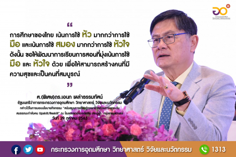 การศึกษาของไทย เน้นการใช้ หัว มากกว่าการใช้ มือ และเน้นการใช้ สมอง มากกว่าการใช้ หัวใจ ดังนั้น ขอให้พัฒนาการเรียนการสอนที่มุ่งเน้นการใช้ มือ และ หัวใจ ด้วยเพื่อให้สามารถสร้างคนที่มีความสุขและเป็นคนที่สมบูรณ์