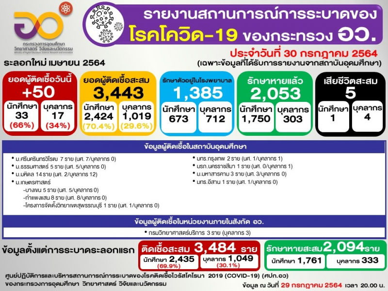 ข้อมูล : ศูนย์ปฏิบัติการและบริหารสถานการณ์การระบาดของโรคติดเชื้อไวรัสโคโรนา 2019 (COVID-19) (ศปก.อว.)