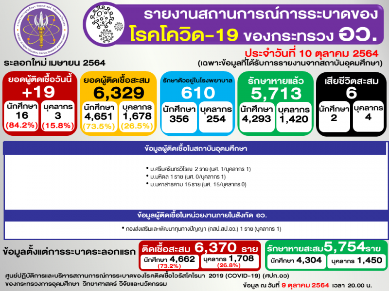 ข้อมูล : ศูนย์ปฏิบัติการและบริหารสถานการณ์การระบาดของโรคติดเชื้อไวรัสโคโรนา 2019 (COVID-19) (ศปก.อว.)
