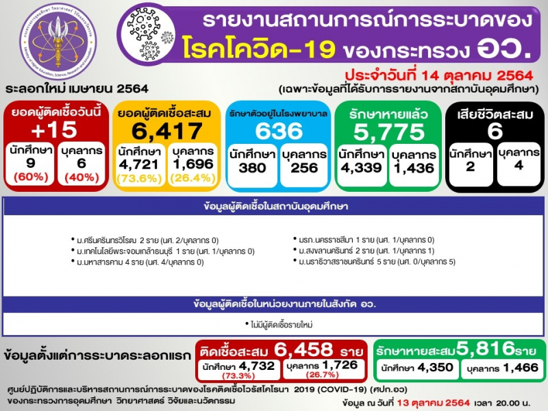 ข้อมูล : ศูนย์ปฏิบัติการและบริหารสถานการณ์การระบาดของโรคติดเชื้อไวรัสโคโรนา 2019 (COVID-19) (ศปก.อว.)
