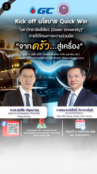 อว. เดินหน้านโยบาย Quick Win “มหาวิทยาลัยสีเขียว” จับมือ GC เปิดตัวโครงการ “จากครัว...สู่เครื่อง” นำร่อง 20 มหาวิทยาลัย ตั้งจุดรับน้ำมันพืชใช้แล้ว เพื่อนำไปผลิตเป็นเชื้อเพลิงอากาศยานยั่งยืน (SAF) หนุนไทยก้าวสู่สังคมคาร์บอนต่ำและเป้าหมาย Net Zero เมื่อวันที่ 14 พฤศจิกายน 2568 ศ.ดร.ศุภชัย ปทุมนากุล ปลัดกระทรวงการอุดมศึกษา วิทยาศาสตร์ วิจัยและนวัตกรรม (อว.) เปิดตัวโครงการ Quick Win “มหาวิทยาลัยสีเขียว” ภายใต้ความร่วมมือ “จากครัว...สู่เครื่อง” ระหว่างกระทรวง อว. และบริษัท พีทีที โกลบอล เคมิคอล จำกัด (มหาชน) (GC) มุ่งส่งเสริมการจัดการน้ำมันพืชใช้แล้วเพื่อนำไปผลิตเป็นเชื้อเพลิงอากาศยานแบบยั่งยืน (SAF) โดยเริ่มตั้งจุดรวบรวมในมหาวิทยาลัยนำร่องกว่า 20 แห่งทั่วประเทศ ภายในงานมีผู้บริหาร อว. และผู้แทน GC เข้าร่วม พร้อมเยี่ยมชมนิทรรศการและรับฟังการบรรยายเกี่ยวกับกระบวนการผลิต SAF ซึ่งเป็นเทคโนโลยีสำคัญต่ออนาคตพลังงานและอุตสาหกรรมการบินคาร์บอนต่ำ ศ.ดร.ศุภชัย กล่าวว่า ความร่วมมือครั้งนี้เป็นกลไกสำคัญผลักดันให้ประเทศไทยเข้าใกล้เป้าหมาย Net Zero เพราะไม่เพียงช่วยลดขยะน้ำมันพืชใช้แล้ว แต่ยังสร้างการมีส่วนร่วมของมหาวิทยาลัยและชุมชน ให้เกิดการเรียนรู้จริงผ่านการลงมือทำ (Learning by Doing) เกิดนวัตกรรมสีเขียว และต่อยอดสู่เศรษฐกิจหมุนเวียน โดยสถาบันอุดมศึกษาจะเป็นศูนย์กลางขับเคลื่อนการเปลี่ยนแปลงด้านสิ่งแวดล้อมสู่ระดับประเทศ ด้านนายณะรงค์ศักดิ์ จิวากานันต์ ประธานเจ้าหน้าที่บริหาร GC เปิดเผยว่า โครงการนี้ต่อยอดจากความสำเร็จในจังหวัดระยอง ที่สามารถรวบรวมน้ำมันใช้แล้วกว่า 7 ตัน ผลิตเป็น SAF สร้างรายได้ให้ชุมชนกว่า 200,000 บาท พร้อมลดการปล่อยก๊าซเรือนกระจกได้อย่างเป็นรูปธรรม การร่วมมือกับกระทรวง อว. จะช่วยขยายผลให้เข้าถึงนักศึกษาและเครือข่ายมหาวิทยาลัยทั่วประเทศ สร้างวัฒนธรรมความยั่งยืน และผลักดันไทยสู่ศูนย์กลางการบินคาร์บอนต่ำของอาเซียน โครงการ “จากครัว...สู่เครื่อง” ยังสอดคล้องกับการพัฒนาโรงกลั่นชีวภาพ (Biorefinery) ของ GC ซึ่งสามารถผลิต SAF รวมถึงเคมีภัณฑ์ชีวภาพและพลาสติกชีวภาพ ช่วยต่อยอดสู่ผลิตภัณฑ์ที่ใช้ในชีวิตประจำวัน และสนับสนุนเศรษฐกิจหมุนเวียนอย่างยั่งยืน #กระทรวงการอุดมศึกษาวิทยาศาสตร์วิจัยและนวัตกรรม #อว #MHESI #GC #จากครัวสู่เครื่อง #GreenUniversity #SAF #NetZero