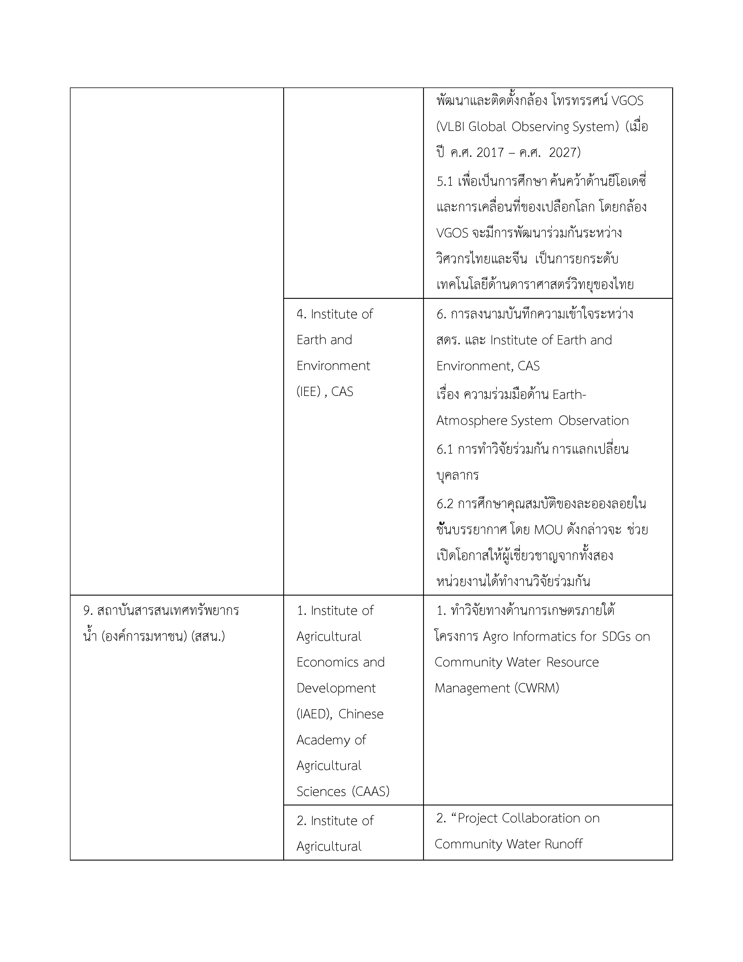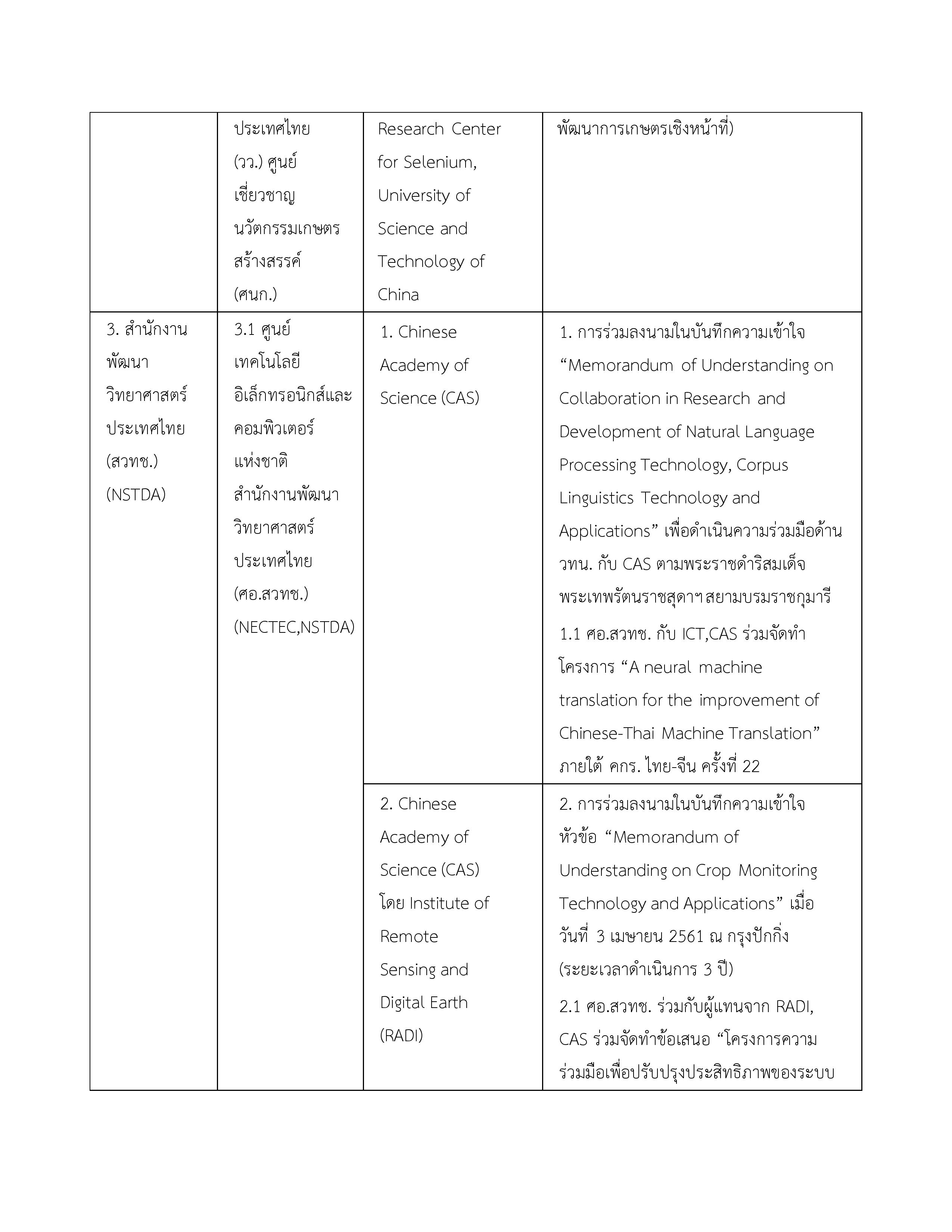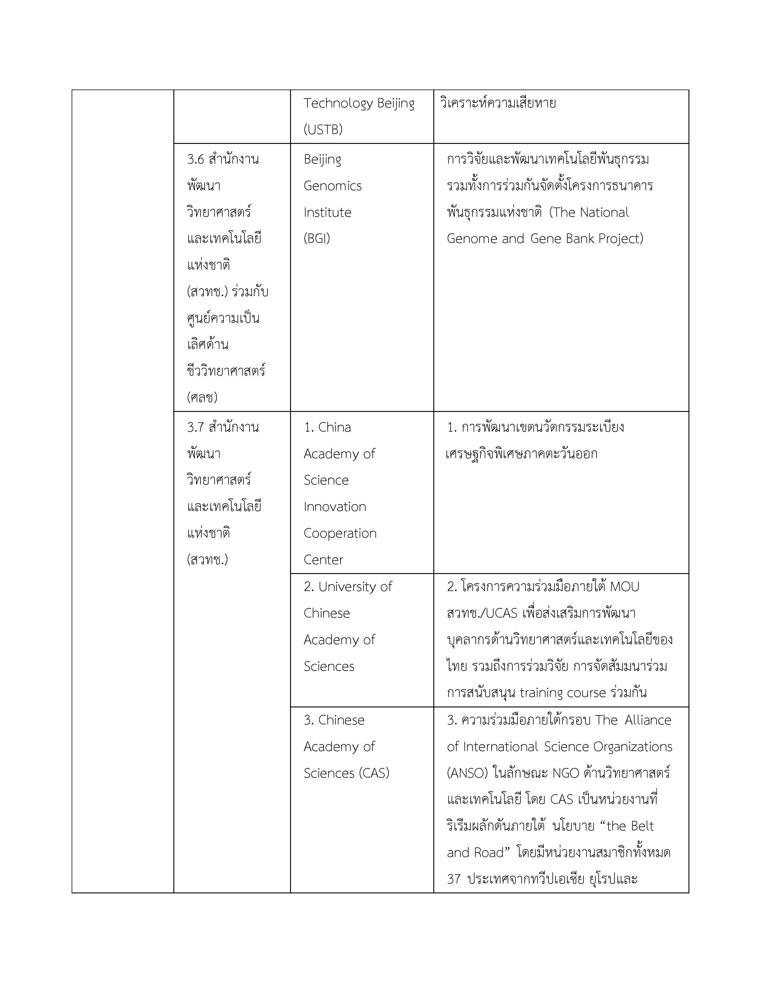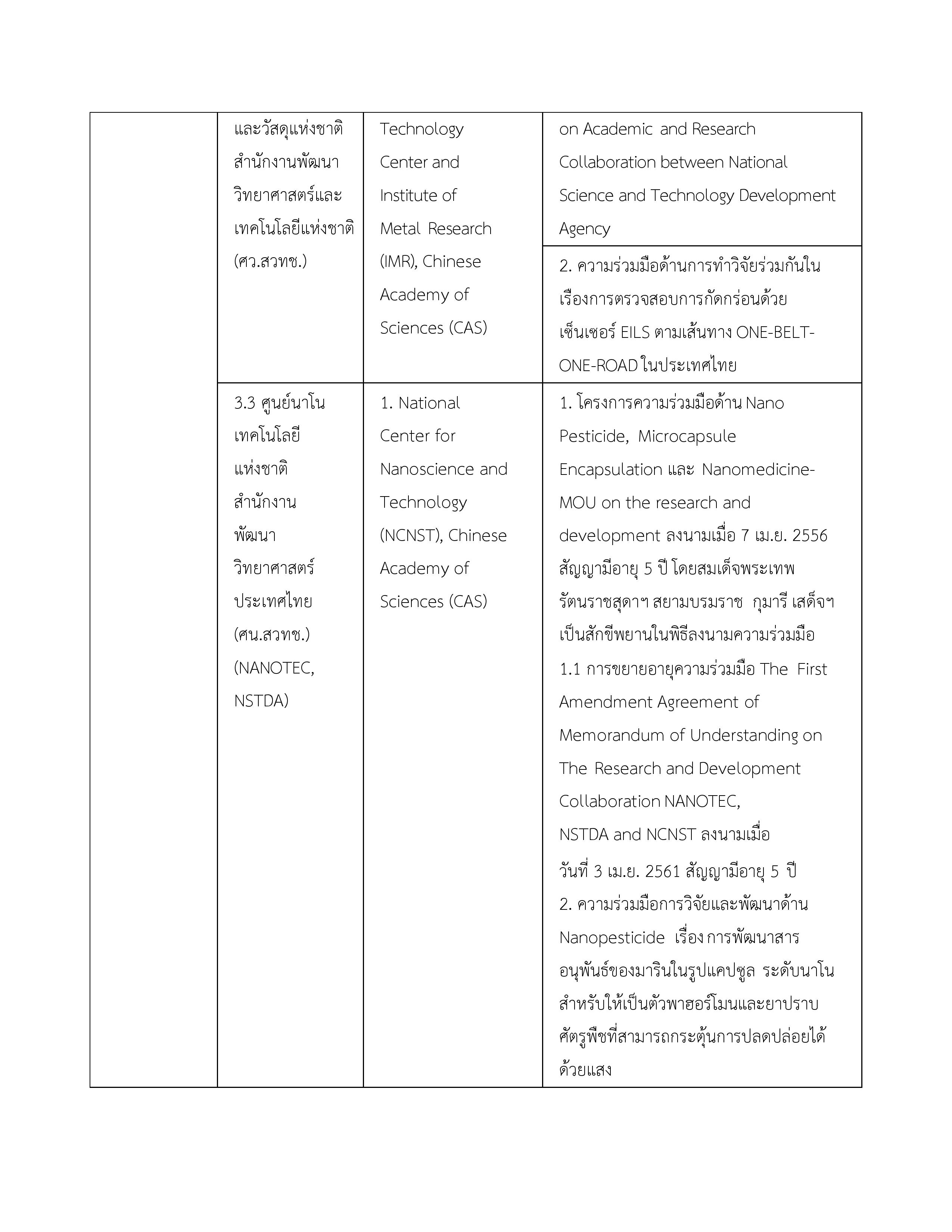 | 3. บันทึกความเข้าใจระหว่างกระทรวงวิทยาศาสตร์และเทคโนโลยีแห่งราชอาณาจักรไทยกับสถาบันบัณฑิตวิทยาศาสตร์จีนแห่งสาธารณรัฐประชาชนจีน | 16 พฤษภาคม 2549 | ไม่มี จนกว่าฝ่ายใดฝ่ายหนึ่งจะแจ้งยกเลิก |