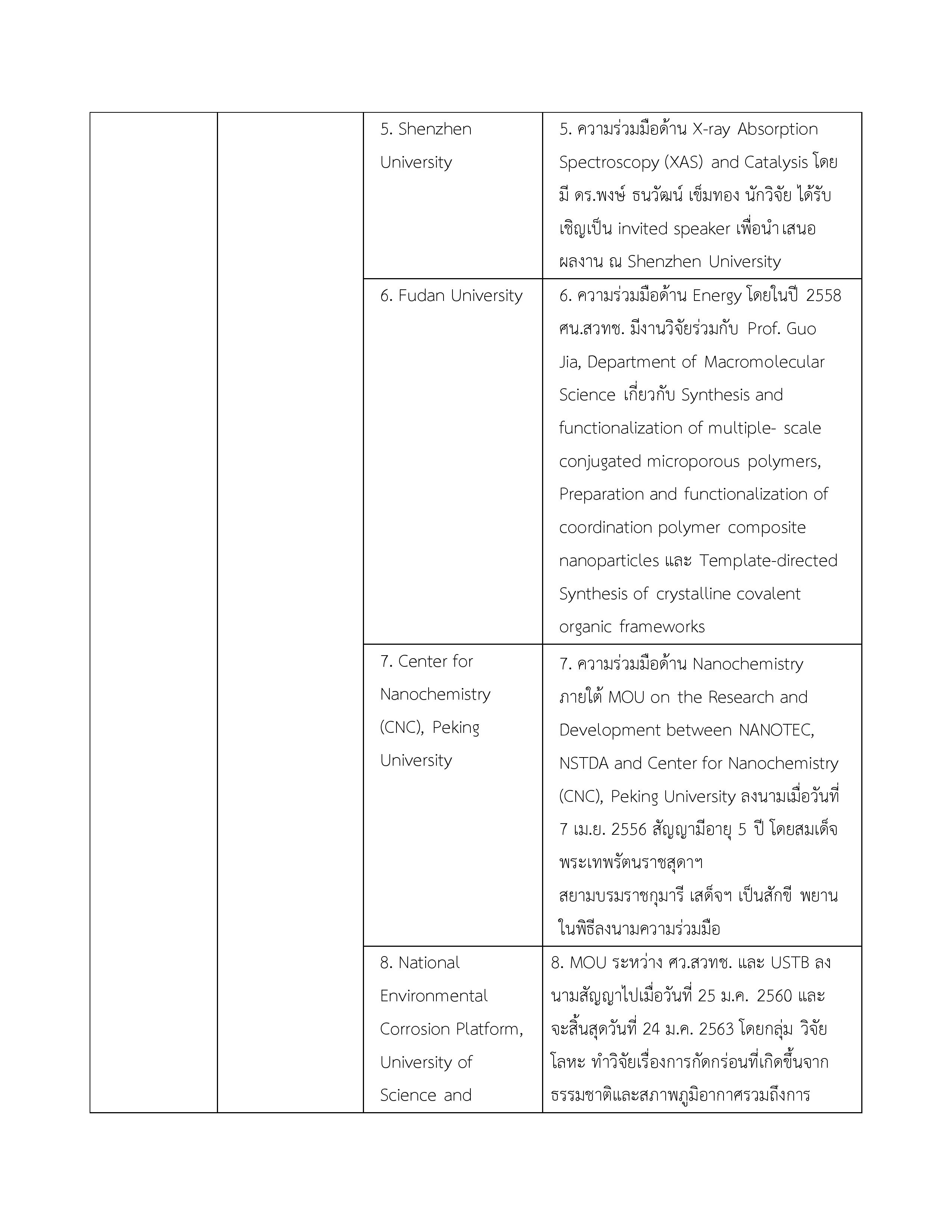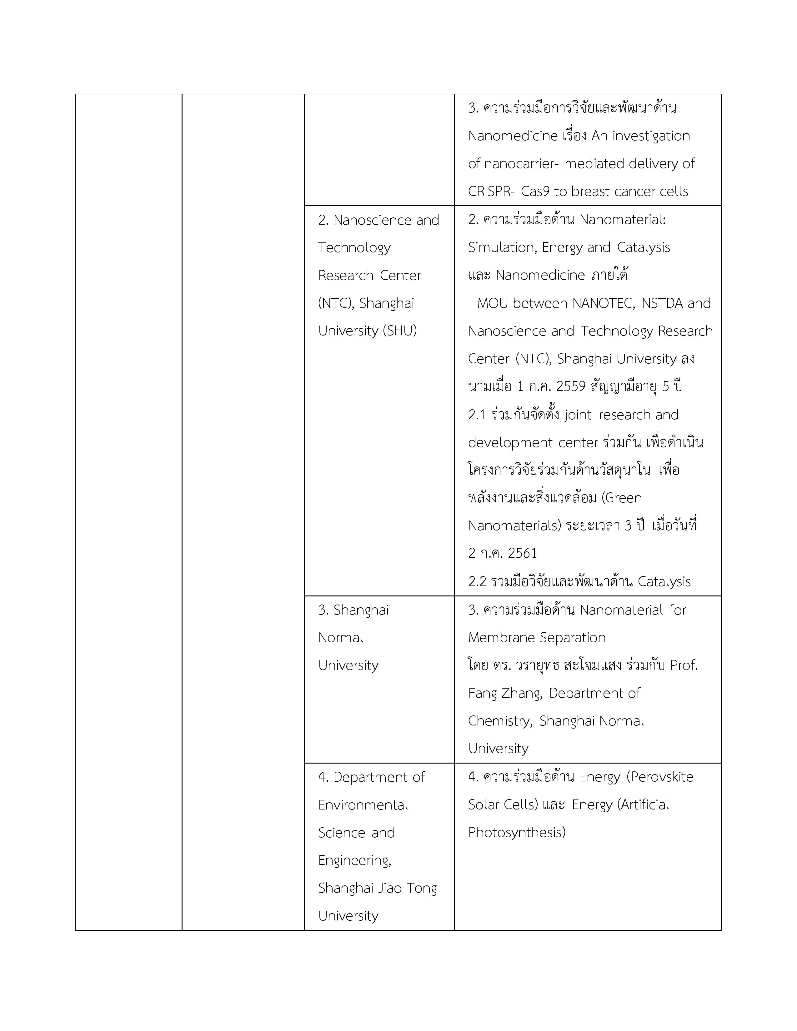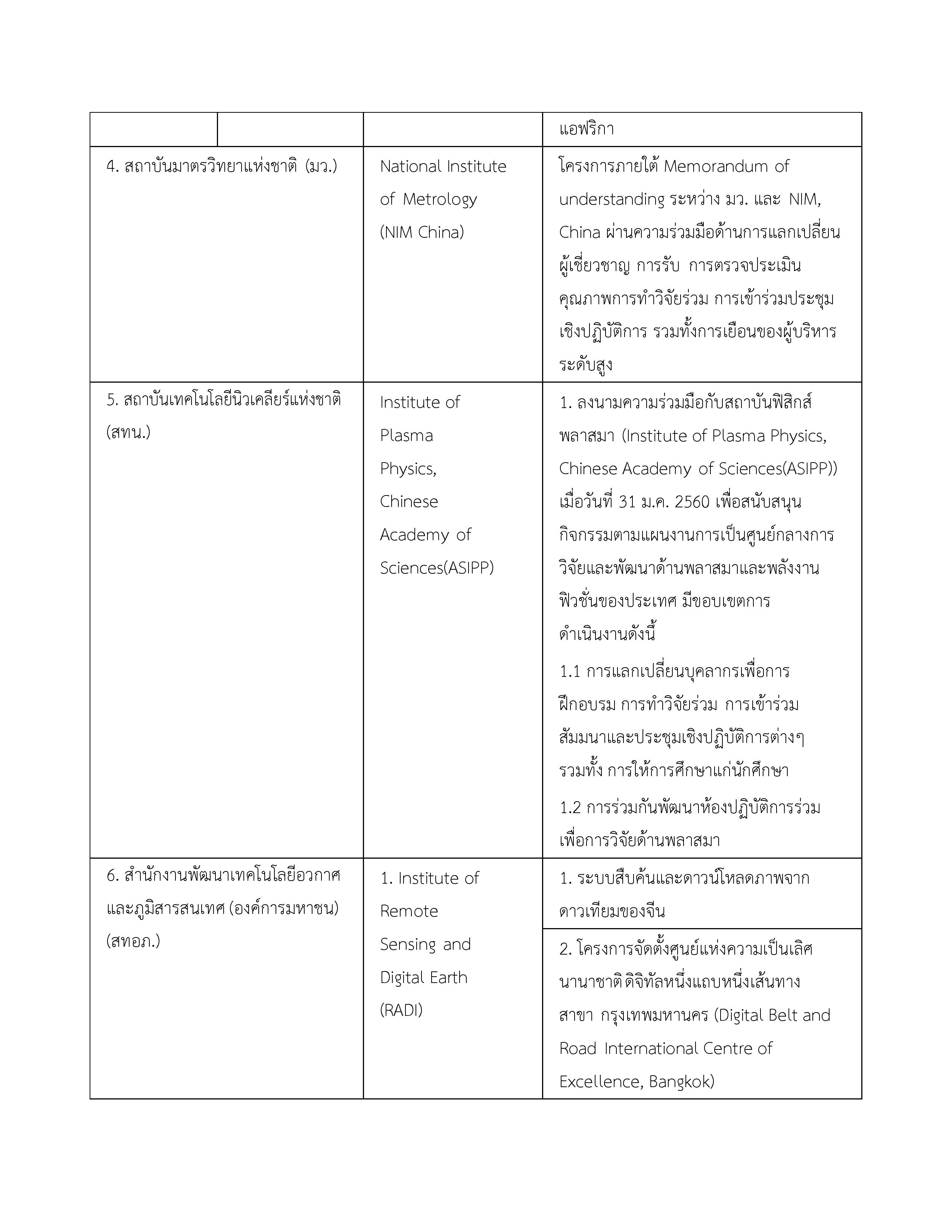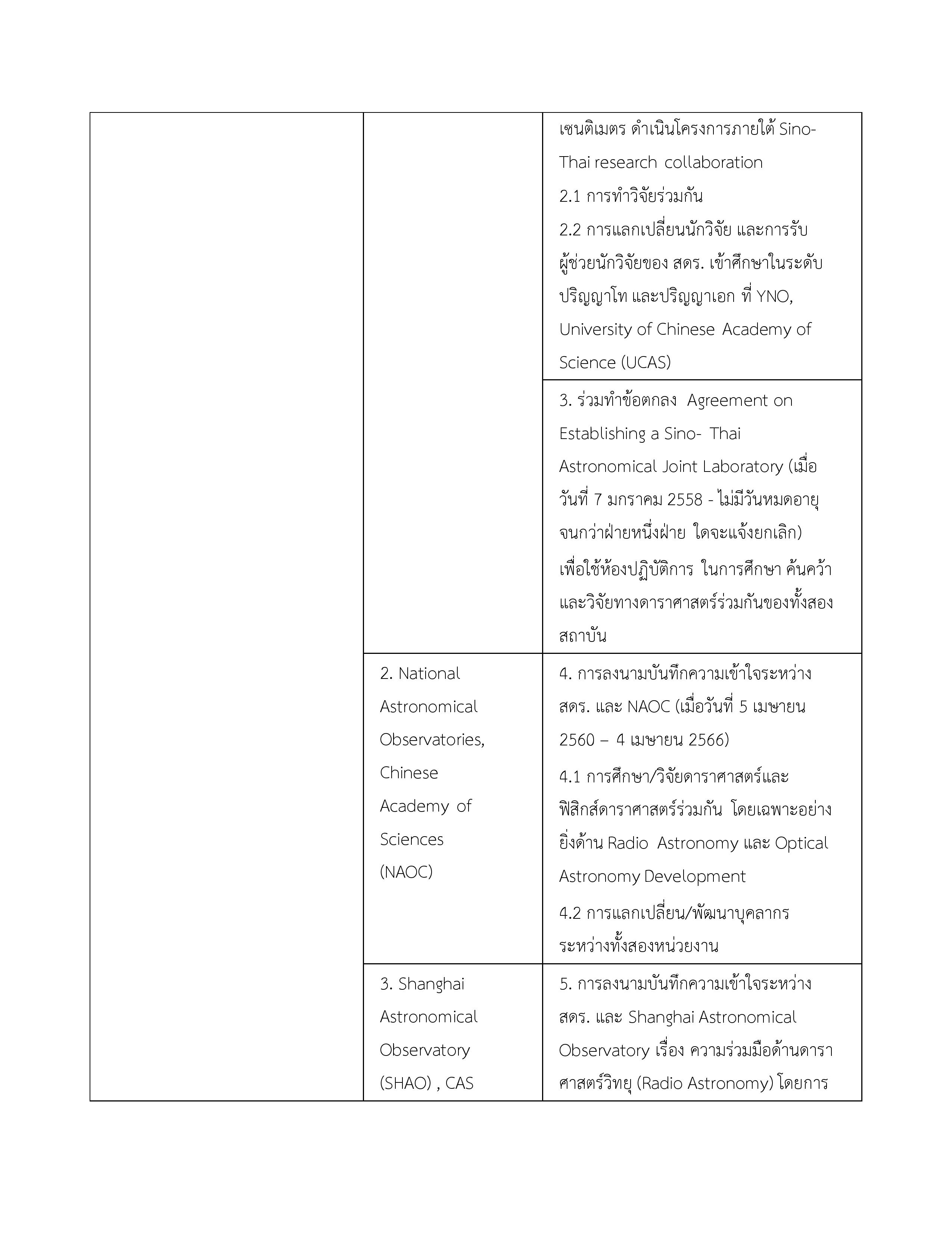 | 1. ข้อตกลงว่าด้วยการส่งเสริมความร่วมมือใน 4 โครงการระหว่างกระทรวงวิทยาศาสตร์และเทคโนโลยีแห่งราชอาณาจักรไทยกับกระทรวงวิทยาศาสตร์และเทคโนโลยีแห่งสาธารณรัฐประชาชนจีน | 11 ตุลาคม 2556 | 10 ตุลาคม 2561 |