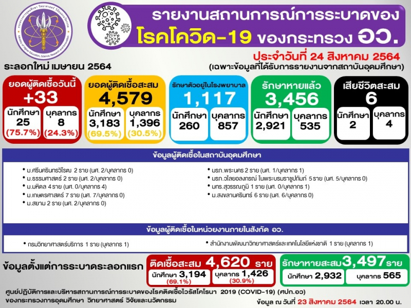 ข้อมูล : ศูนย์ปฏิบัติการและบริหารสถานการณ์การระบาดของโรคติดเชื้อไวรัสโคโรนา 2019 (COVID-19) (ศปก.อว.)