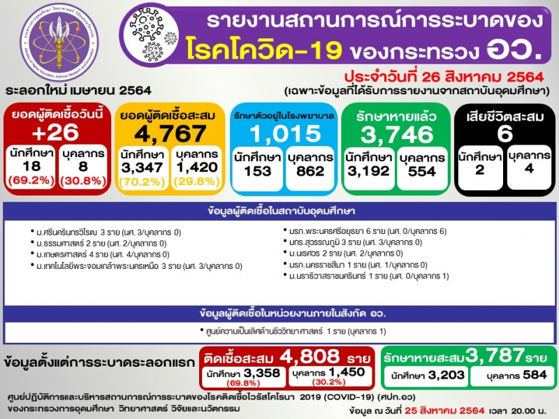 ข้อมูล : ศูนย์ปฏิบัติการและบริหารสถานการณ์การระบาดของโรคติดเชื้อไวรัสโคโรนา 2019 (COVID-19) (ศปก.อว.)
