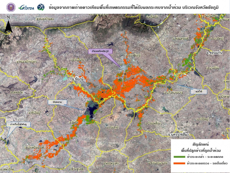 GISTDA ใช้ข้อมูลภาพจากดาวเทียมวิเคราะห์พื้นที่ปลูกข้าวในเขตอำเภอเมืองชัยภูมิ อำเภอจัตุรัส อำเภอบ้านเขว้า และอำเภอบำเหน็จณรงค์ คาดการณ์ว่าจะได้รับความเสียหายประมาณ 160,000 ไร่ ซึ่งส่วนใหญ่เป็นข้าวระยะออกรวงและรอการเก็บเกี่ยว (สีส้ม)