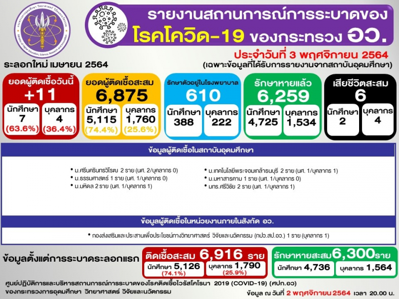 ข้อมูล : ศูนย์ปฏิบัติการและบริหารสถานการณ์การระบาดของโรคติดเชื้อไวรัสโคโรนา 2019 (COVID-19) (ศปก.อว.)