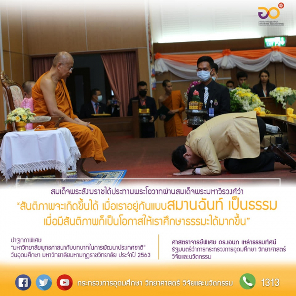 มหาวิทยาลัยไทยทั่วไป เราเอาแบบฝรั่ง คือ แยกเรื่องโลกและเรื่องธรรมออกจากกัน แต่จริงๆ แล้ว ทั้งสองอย่างนี้ต้องไม่ขาดออกจากกัน มหาวิทยาลัยพุทธศาสนามีความสำคัญมาก ผมมีนโยบายให้จัดเป็น "มหาวิทยาลัยประเภทที่ 1 ใน 5 ประเภทของมหาวิทยาลัยไทย โดยเป็นมหาวิทยาลัยที่ใช้ธรรมะและปัญญานำวิชาการ นำชีวิตทางโลก" ถ้าทำได้ประเทศไทยจะมีนวัตกรรมไม่เหมือนฝรั่งทำมา