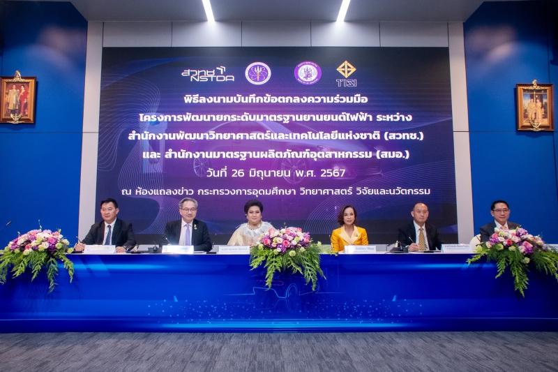 เมื่อวันที่ 26 มิ.ย. น.ส.ศุภมาส อิศรภักดี รมว.การอุดมศึกษา วิทยาศาสตร์ วิจัยและนวัตกรรม (อว.) และ น.ส.พิมพ์ภัทรา วิชัยกุล รมว.อุตสาหกรรม (อก.) และ น.ส.หวัง ซือ ซือ เลขานุการเอกอัครราชทูตสาธารณรัฐประชาชนจีนประจำประเทศไทย ร่วมเป็นสักขีพยานและกล่าวแสดงความยินดี ในพิธีลงนามบันทึกข้อตกลงความร่วมมือ โครงการพัฒนายกระดับมาตรฐานยานยนต์ไฟฟ้า ระหว่าง สำนักงานพัฒนาวิทยาศาสตร์และเทคโนโลยีแห่งชาติ (สวทช.) กับ สำนักงานมาตรฐานผลิตภัณฑ์อุตสาหกรรม (สมอ.) และบันทึกข้อตกลงความร่วมมือ การขับเคลื่อนอุตสาหกรรมยานยนต์ไฟฟ้า ด้านการวิเคราะห์ทดสอบยานยนต์ไฟฟ้าและอุปกรณ์ที่เกี่ยวข้อง ของศูนย์ความเป็นเลิศด้านยานยนต์ไฟฟ้าประเทศไทย (Thailand EV Center of Excellence: TECE) ระหว่าง สวทช. กับ China Automotive Engineering Research Institute (CAERI) โดยมี ศาสตราจารย์ ดร.ชูกิจ ลิมปิจำนงค์ ผอ.สวทช. และนายวีรพงษ์ เอี่ยมเจริญชัย รองเลขาธิการ สมอ. ลงนามในบันทึกความร่วมมือชุดแรก และ ผอ.สวทช. ร่วมกับ นายโจหยูหลิน (Mr. Zhou Yu Lin) Chairman and Party Secretary of China Automotive Engineering Research Institute (CAERI) ร่วมลงนามในบันทึกชุดที่สอง พร้อมกันนี้ มีนายเพิ่มสุข สัจจาภิวัฒน์ ปลัดกระทรวง อว. ผู้แทนหน่วยงานรัฐ และเอกชน เข้าร่วม ที่ห้องแถลงข่าวชั้น 1 อาคารพระจอมเกล้า กระทรวง อว. ถ.พระรามที่ 6 กรุงเทพฯ