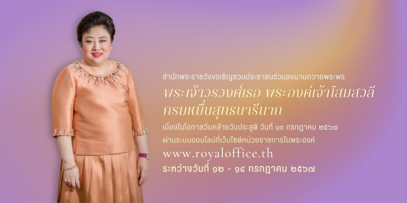 สำนักพระราชวัง ขอเชิญชวนประชาชนร่วมลงนามถวายพระพร พระเจ้าวรวงศ์เธอ พระองค์เจ้าโสมสวลี กรมหมื่นสุทธนารีนาถ เนื่องในโอกาสวันคล้ายวันประสูติ วันที่ ๑๓ กรกฎาคม ๒๕๖๗ ผ่านระบบออนไลน์ ที่เว็บไซต์หน่วยราชการในพระองค์ www.royaloffice.th ระหว่างวันที่ ๑๒ – ๑๔ กรกฎาคม ๒๕๖๗