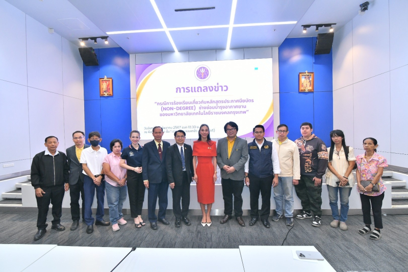 เมื่อวันที่ 23 ธ.ค. น.ส.สุชาดา ซาง แทนทรัพย์ เลขานุการ รมว.การอุดมศึกษา วิทยาศาสตร์ วิจัยและนวัตกรรม (อว.) พร้อมด้วย นายวันนี นนท์ศิริ ผู้ตรวจราชการกระทรวง อว. นายบุญช่วย เจริญผล ผู้ช่วยอธิการบดีมหาวิทยาลัยเทคโนโลยีราชมงคลกรุงเทพ (มทร.กรุงเทพ) คณะผู้บริหาร มทร.กรุงเทพ และ รศ.ดร.วีรชัย พุทธวงษ์ ผู้ช่วยอธิการบดีมหาวิทยาลัยเกษตรศาสตร์ หรือ อ.อ๊อด และมูลนิธิรณรงค์ทวงคืนความยุติธรรม ร่วมแถลงข่าว “กรณีการร้องเรียนเกี่ยวกับหลักสูตรประกาศนียบัตร (Non-Degree) ช่างซ่อมบำรุงอากาศยาน ของ มทร.กรุงเทพ ที่ ห้องแถลงข่าว อาคารพระจอมเกล้า สำนักงานปลัดกระทรวง อว. (โยธี)