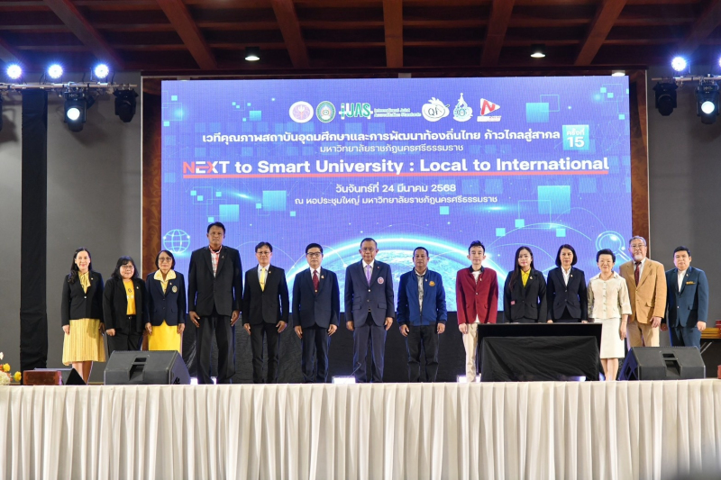 เมื่อวันที่ 24 มี.ค. นายศุภชัย ใจสมุทร ผู้ช่วยรัฐมนตรีประจำกระทรวงการอุดมศึกษา วิทยาศาสตร์ วิจัยและนวัตกรรม (อว.) เป็นประธานเปิดกิจกรรมเวทีคุณภาพสถาบันอุดมศึกษาและการพัฒนาท้องถิ่นไทย ก้าวไกลสู่สากล ครั้งที่ 15 มหาวิทยาลัยราชภัฏนครศรีธรรมราช “NEXT to Smart University: Local to International” พร้อมทั้งบรรยายพิเศษในหัวข้อ “อุดมศึกษาไทยยุคใหม่ ก้าวสู่ระดับสากล” โดยมี ดร.สมปอง รักษาธรรม รักษาราชการแทนอธิการบดี มหาวิทยาลัยราชภัฏนครศรีธรรรมราช กล่าวรายงาน และมี ศ.ดร.ทาโร่ โมจิซึกิ ผู้ทรงคุณวุฒิและผู้ประเมิน International Joint Accreditation Standards (iJAS Plus) รศ.ดร.นวลทิพย์ กมลวารินทร์ ผู้ทรงคุณวุฒิและผู้ประเมิน iJAS Plus นาวาตรีหญิง ดร.กิตติยา เอ็ฟฟานส รองผู้อำนวยการสำนักงานรับรองมาตรฐานและประเมินคุณภาพการศึกษา (องค์การมหาชน) (สมศ.) คณะผู้บริหารจาก มรภ.นครศรีธรรมราช มรภ.ยะลา มรภ.สงขลา มรภ.สุราษฎร์ธานี มรภ.ภูเก็ต ม.หาดใหญ่ มทร.ศรีวิชัย ม.มหามกุฏราชวิทยาลัย วิทยาเขตล้านนา ม.สงขลานครินทร์ วิทยาเขตปัตตานี และ ม.มหามกุฎราชวิทยาลัย วิทยาเขตศรีธรรมโศกราช เข้าร่วม ณ หอประชุมใหญ่ มรภ.นครศรีธรรรมราช