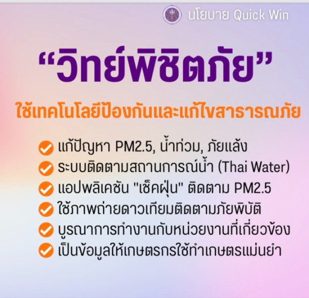ขณะเดียวกันจะนำองค์ความรู้ด้านเทคโนโลยีและนวัตกรรมมาใช้แก้ไขปัญหาสิ่งแวดล้อมและภัยพิบัติ เช่น ระบบติดตามสถานการณ์น้ำและและแอปพลิเคชัน Thai Water จากคลังข้อมูลน้ำแห่งชาติ และการใช้ภาพถ่ายดาวเทียมเพื่อติดตามพื้นที่ที่ได้รับผลกระทบจากน้ำท่วม ช่วยเฝ้าระวัง แจ้งเตือน วิเคราะห์ วางแผน และตัดสินใจแก้ไขปัญหา นอกจากนี้ ยังมีการใช้ข้อมูลดาวเทียมในการติดตามและประเมินสถานการณ์ PM 2.5 ผ่านแอปพลิเคชัน "เช็คฝุ่น" ซึ่งระบบทั้งหมดที่จัดทำขึ้น นอกจากเป็นการป้องกันและบรรเทาสาธารณภัยแล้ว ยังช่วยพยากรณ์และวิเคราะห์สภาพอากาศ สถานการณ์น้ำ เพื่อเป็นข้อมูลสำหรับทำการเกษตรให้แม่นยำขึ้นได้อีกด้วย