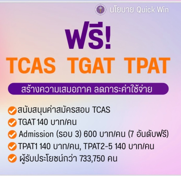 นายสุรศักดิ์ กล่าวอีกว่า ส่วนนโยบายด้านการอุดมศึกษา กระทรวง อว.พร้อมเดินหน้าสนับสนุนค่าสมัครสอบค่าสมัครสอบ TCAS เพื่อลดภาระให้กับนักเรียนและผู้ปกครอง นโยบายนี้เป็นนโยบายของพรรคภูมิใจไทย ตนก็จะดำเนินการต่อเนื่องและดำเนินการอย่างเข้มข้นต่อไปในการสอบ TCAS69 โดยจะสนับสนุนค่าสมัครสอบ TGAT ในอัตรา 140 บาทต่อคน และค่าสมัครสอบรอบ 3 (Admission) ในระบบ TCAS เพิ่มเติม โดยผู้สมัครสามารถเลือกสมัครได้สูงสุด 7 อันดับฟรี ในอัตรา 600 บาทต่อคนนอกจากนี้ ยังจะสนับสนุนค่าสมัครสอบวัดความถนัดทางวิชาการและวิชาชีพ TPAT1-5 (TPAT 1 อัตรา 140 บาทต่อคน และ TPAT 2-5 อัตรา 140 บาทต่อคน) ซึ่งคาดว่าจะมีนักเรียนและผู้ปกครองได้รับประโยชน์กว่า 733,750 คน รวมทั้ง สนับสนุนทุนการศึกษาในรูปแบบต่างๆ ให้กับนักศึกษา ขณะเดียวกัน จะเร่งขับเคลื่อน Credit Bank หรือระบบคลังหน่วยกิต ให้เป็นกลไกหลักในการสะสมและเทียบโอนหน่วยกิตจากประสบการณ์การทำงานและการเรียนรู้จากแหล่งต่างๆ อย่างเป็นรูปธรรม โดยตั้งเป้าให้มีความพร้อมสมบูรณ์ภายในปี 2570