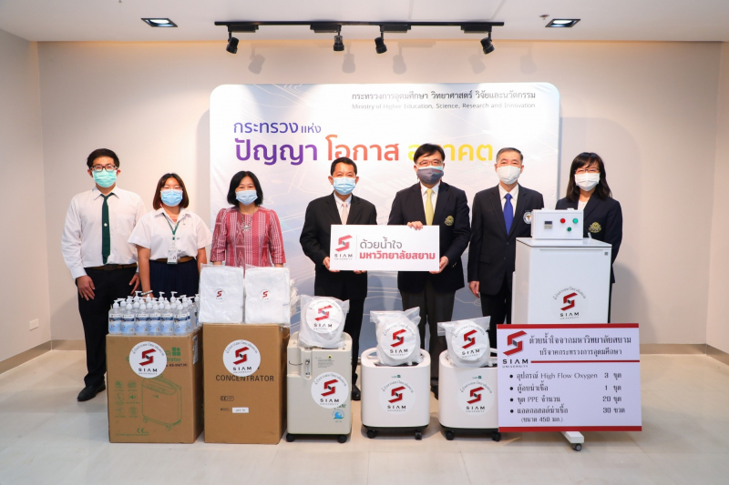 วันนี้ (11 พฤษภาคม 2564) ศ.ดร.นพ.สิริฤกษ์ ทรงศิวิไล ปลัดกระทรวงการอุดมศึกษา วิทยาศาสตร์ วิจัยและนวัตกรรม (อว.) รับมอบสิ่งของบริจาค จาก ดร.พรชัย มงคลวนิช อธิการบดีมหาวิทยาลัยสยาม ที่ได้บริจาคอุปกรณ์ทางการแพทย์ให้กับกระทรวงการอุดมศึกษา วิทยาศาสตร์ วิจัยและนวัตกรรม เพื่อสนับสนุนการใช้ประโยชน์ในโรงพยาบาลสนามของ อว. โดยรายนามสิ่งของบริจาคมีดังต่อไปนี้ ตู้อบฆ่าเชื้ออุปกรณ์การแพทย์ด้วยแสง UV ซึ่งออกแบบและจัดสร้างโดยคณะวิศวกรรมศาสตร์ มหาวิทยาลัยสยาม จำนวน 1 เครื่อง, อุปกรณ์ผลิต High Flow Oxygen พร้อมสายสำรอง จำนวน 3 เครื่อง, ชุด PPE จำนวน 20 ชุด, เจลแอลกอฮอล์ฆ่าเชื้อ จำนวน 30 ขวด ณ อาคารพระจอมเกล้า ชั้น 1 สำนักงานปลัดกระทรวง ถนนโยธี