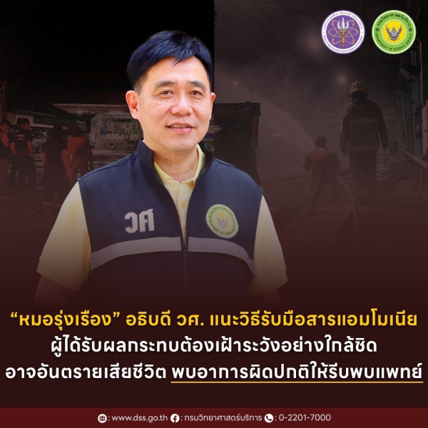 นายแพทย์รุ่งเรือง กิจผาติ อธิบดีกรมวิทยาศาสตร์บริการ (วศ.) กระทรวงการอุดมศึกษา วิทยาศาสตร์ วิจัยและนวัตกรรม (อว.) ให้ข้อมูลว่า “แอมโมเนีย” ชื่อทางเคมี คือ แอมโมเนีย แอนไฮดรัส (Ammonia Anhydrous) สูตรเคมี คือ NH₃ มวลโมเลกุล 17.03 จุดเดือด -33.35 องศาเซลเซียส จุดหลอมเหลว -77.7 องศาเซลเซียส มีสถานะทั้งที่เป็นของเหลวและก๊าซ ตามที่เป็นข่าวนั้นคือ แอมโมเนียในสถานะก๊าซเป็นก๊าซที่ไม่มีสี มีกลิ่นฉุนรุนแรง สามารถละลายน้ำได้ดี จัดเป็นสารเคมีอันตรายประเภท ก๊าซพิษและกัดกร่อน (Gases-Corrosive) เนื่องจากมีจุดเดือดต่ำ ราคาถูก ไม่ทำลายชั้นโอโซนในบรรยากาศเมื่อเทียบ กับสารทำความเย็นคลอโรฟลูออโรคาร์บอน (CFC) ชนิดอื่นๆ และมีประสิทธิภาพสูงในการทำความเย็น จึงนิยมนำมาเป็นสารนำความเย็นในระบบทำความเย็นโดยเฉพาะโรงงานทำน้ำแข็งและอุตสาหกรรมห้องเย็น เมื่อเกิดการรั่วไหลก๊าซแอมโมเนียจะรวมตัวกับความชื้นในอากาศทําให้เกิดเป็นหมอกควันสีขาวของแอมโมเนียมไฮดรอกไซด์