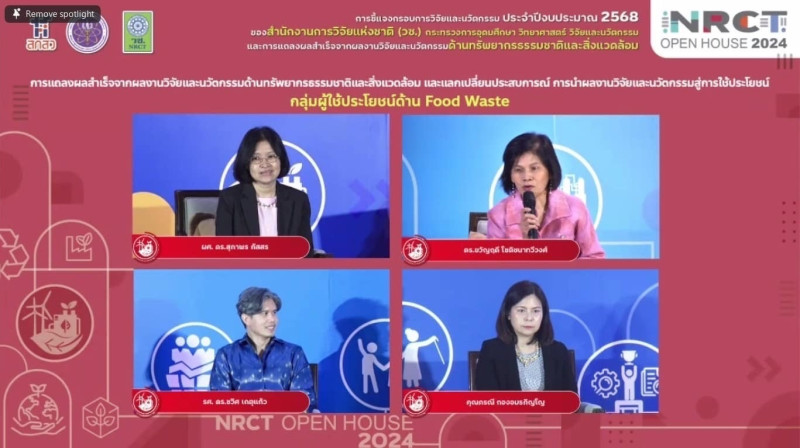 (3) กลุ่มผู้ใช้ประโยชน์ด้าน Food Waste โดย ดร.ขวัญฤดี โชติชนาทวีวงศ์ จากศูนย์ประสานเพื่อพัฒนาโจทย์วิจัยสู่การใช้ประโยชน์ด้านสิ่งแวดล้อม วช. คุณภรณี กองอมรภิญโญ ผู้แทนหน่วยงานผู้ร่วมผลักดันผลงานวิจัยสู่การใช้ประโยชน์จากกลุ่มบริษัท ดาว ประเทศไทย รศ.ดร.ชวิศ เกตุแก้ว นักวิจัยจากมหาวิทยาลัยขอนแก่น และ ผศ. ดร.สุภาพร ภัสสร นักวิจัยจากมหาวิทยาลัยพะเยา
