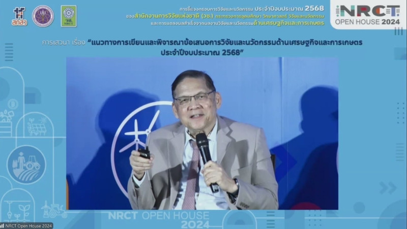 และมีการแถลงผลสำเร็จจากการวิจัยและนวัตกรรม NRCT Open House 2024 ด้านเศรษฐกิจและการเกษตร โดย คุณสุภาพร โชคเฉลิมวงศ์ ผู้อำนวยการกองบริหารทุนวิจัยและนวัตกรรม 1
