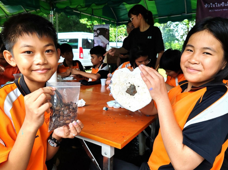 ปิดท้ายด้วย ดร.นัฐวุฒิ บุญยืน นักวิจัย ทีมวิจัยปฏิสัมพันธ์ของจุลินทรีย์ทางการเกษตร ไบโอเทค สวทช. กล่าวถึงกิจกรรมการทำหัวใจไมซีเลี่ยมสำหรับปลูกป่าลด carbon footprint และทำอิฐชีวภาพว่า กิจกรรมสาธิตและอบรมการทำหัวใจ BCG Nature Heart (Mycelium-Based Composite) และอิฐชีวภาพ (biobrick) เป็นกิจกรรมเพื่อพัฒนาและยกระดับผลิตภัณฑ์จากวัสดุเหลือทิ้งทางการเกษตรโดยใช้วิทยาศาสตร์ เทคโนโลยี และนวัตกรรม เชื่อมโยงข้อมูลด้านจุลินทรีย์และเห็ดรานำไปส่งเสริมเศรษฐกิจฐานรากของชุมชนและเศรษฐกิจสร้างสรรค์ในพื้นที่ในโครงการฯ และพื้นที่ชุมชนโดยรอบและพื้นที่ภายใต้ความร่วมมือ โดยได้ให้น้อง ๆ ได้ทำไมซีเลี่ยมรูปหัวใจสำหรับฟื้นฟูป่าธรรมชาติ และอิฐชีวภาพรักษ์โลกจากเศษวัสดุเหลือทิ้งทางการเกษตรและกากกาแฟจากพื้นที่ และร่วมกันปลูกป่าจากหัวใจไมซีเลี่ยมที่น้อง ๆ ทำขึ้นเองด้วย