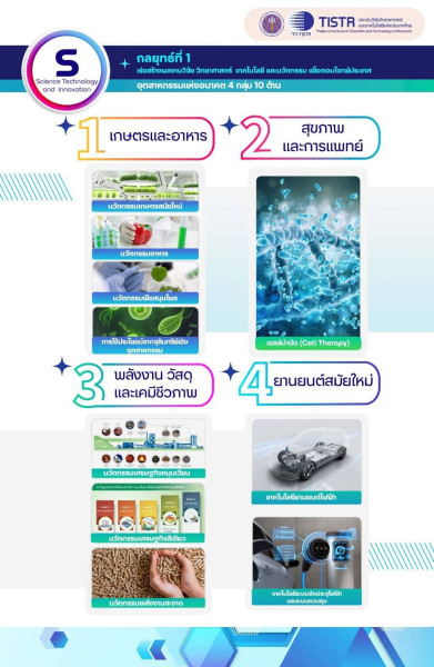 กลยุทธ์ที่ 1 S : Science Technology and Innovation เร่งสร้างผลงานวิจัย วิทยาศาสตร์ เทคโนโลยีและนวัตกรรม เพี่อตอบโจทย์ประเทศ ในขอบข่ายอุตสาหกรรมแห่งอนาคต 4 กลุ่ม ( 1.เกษตรและอาหาร 2.สุขภาพและการแพทย์ 3.พลังงาน วัสดุและเคมีชีวภาพ 4.ยานยนต์สมัยใหม่) และครอบคลุม 10 ด้าน (1.นวัตกรรมเกษตรสมัยใหม่ 2.นวัตกรรมอาหาร 3.นวัตกรรมพืชสมุนไพร 4.การใช้ประโยชน์จากจุลินทรีย์เชิงอุตสาหกรรม 5.เซลล์บำบัด 6.นวัตกรรมเศรษฐกิจหมุนเวียน 7.นวัตกรรมเศรษฐกิจสีเขียว 8.นวัตกรรมพลังงานสะอาด 9.เทคโนโลยียานยนต์ไฟฟ้าและชิ้นส่วน และ 10.เทคโนโลยีระบบอัดประจุไฟฟ้าและระบบควบคุม)