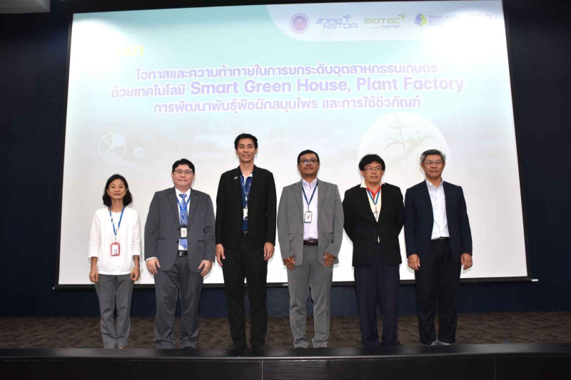 ปทุมธานี 20 พฤษภาคม 2568 - สำนักงานพัฒนาวิทยาศาสตร์และเทคโนโลยีแห่งชาติ (สวทช.) โดยโปรแกรมสนับสนุนการพัฒนาเทคโนโลยีและนวัตกรรม (ITAP) ร่วมกับ ศูนย์พันธุวิศวกรรมและเทคโนโลยีชีวภาพแห่งชาติ (BIOTEC) และอุทยานวิทยาศาสตร์ประเทศไทย (อวท.) จัดสัมมนา “โอกาสและความท้ายในการยกระดับอุตสาหกรรมเกษตร ด้วยเทคโนโลยี Smart Green House, Plant Factory การพัฒนาพันธุ์พืชผักสมุนไพร และการใช้ชีวภัณฑ์” เพื่อนำเสนอองค์ความรู้และผลงานวิจัยของ สวทช. ไปสู่การประยุกต์ใช้จริงในภาคอุตสาหกรรมเกษตร ประกอบด้วย เทคโนโลยี Smart Green House (โรงเรือนอัจฉริยะ) Plant Factory (โรงงานผลิตพืช) การพัฒนาพันธุ์พืชผักสมุนไพร และการใช้ชีวภัณฑ์ ซึ่งล้วนเป็นเครื่องมือสำคัญที่จะช่วยเพิ่มประสิทธิภาพ ลดต้นทุน และสร้างมูลค่าเพิ่มให้กับผลผลิตทางการเกษตร เพื่อให้ผู้ประกอบการอุตสาหกรรมเกษตรได้นำเทคโนโลยีและนวัตกรรมไปต่อยอดและประยุกต์ใช้ในการพัฒนาธุรกิจเกษตรปลอดภัยให้เติบโตอย่างยั่งยืนและมีประสิทธิภาพยิ่งขึ้น