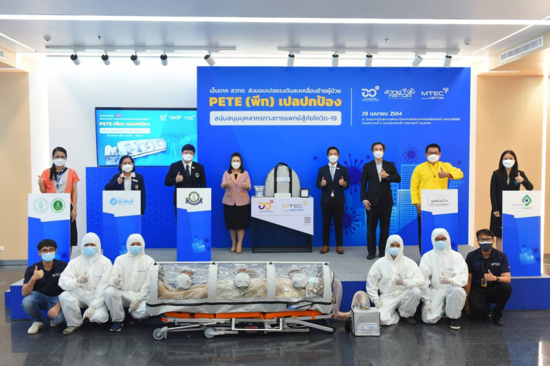 ผู้ช่วยผู้อำนวยการ สวทช. กล่าวว่าวันนี้ทีมวิจัย เอ็มเทค สวทช. ได้ส่งมอบ PETE (พีท) เปลปกป้อง : เปลความดันลบเคลื่อนย้ายผู้ป่วย รวมจำนวน 5 ชุด ได้แก่ 1. คณะแพทยศาสตร์วชิรพยาบาล มหาวิทยาลัยนวมินทราธิราช 2. โรงพยาบาลสนามเอราวัณ 2 ของโรงพยาบาลเวชการุณย์รัศมิ์ กทม. 3. มูลนิธิรวมน้ำใจ (คลองเตย) กทม. 4. โรงพยาบาลวิภาวดี กทม. 5. โรงพยาบาลเซนต์เมรี่ จังหวัดนครราชสีมา เพื่อใช้ในการป้องกันการแพร่กระจายเชื้อของโรคโควิด-19 ระลอกใหม่ ตั้งแต่การเคลื่อนย้ายผู้ป่วยด้วยรถพยาบาลจนถึงการนำผู้ป่วยเข้าเครื่องเอกซเรย์ปอดและเครื่องซีที สแกน (CT scan) โดยไม่ต้องนำผู้ป่วยออกจากเปลความดันลบ ช่วยลดการแพร่เชื้อโรคบนอุปกรณ์ทางการแพทย์และสถานพยาบาล