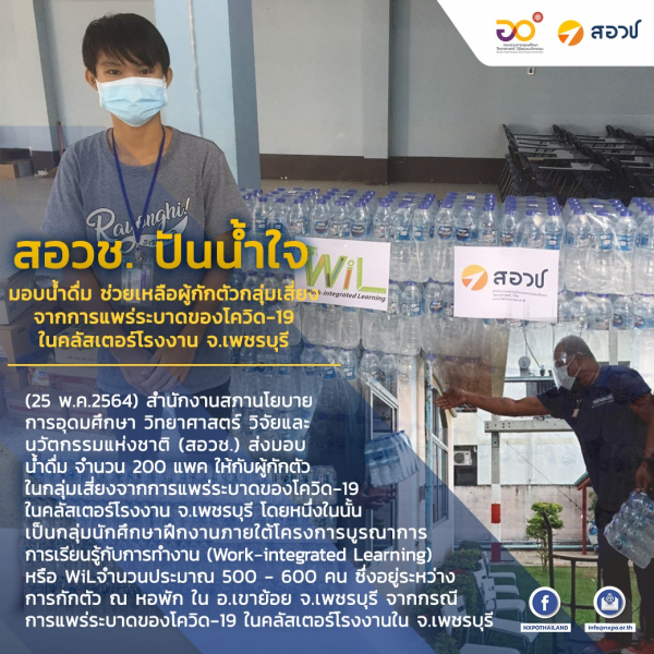 (25 พฤษภาคม 2564) สำนักงานสภานโยบายการอุดมศึกษา วิทยาศาสตร์ วิจัยและนวัตกรรมแห่งชาติ (สอวช.) ส่งมอบน้ำดื่ม จำนวน 200 แพค ให้กับผู้กักตัวในกลุ่มเสี่ยงจากการแพร่ระบาดของโควิด-19 ในคลัสเตอร์โรงงาน จ.เพชรบุรี โดยหนึ่งในนั้นเป็นกลุ่มนักศึกษาฝึกงานภายใต้โครงการบูรณาการการเรียนรู้กับการทำงาน (Work-integrated Learning: WiL) จำนวนประมาณ 500 – 600 คน ซึ่งอยู่ระหว่างการกักตัว ณ หอพัก ในอำเภอเขาย้อย จังหวัดเพชรบุรี จากกรณีการแพร่ระบาดของโควิด-19 ในคลัสเตอร์โรงงานในจังหวัดเพชรบุรี