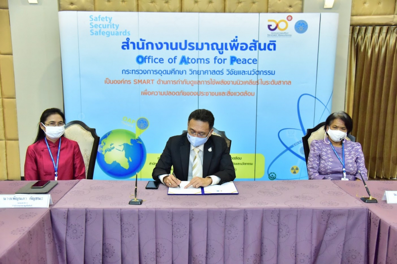 นายเพิ่มสุข สัจจาภิวัฒน์ เลขาธิการสำนักงานปรมาณูเพื่อสันติ ลงนามบันทึกความร่วมมือ (MOU) ทางวิชาการเพื่อพัฒนาศักยภาพด้านการกำกับดูแลความปลอดภัยทางนิวเคลียร์และรังสี ร่วมกับผู้ช่วยศาสตราจารย์ ดร.สมหมาย ผิวสอาด อธิการบดีมหาวิทยาลัยเทคโนโลยีราชมงคลธัญบุรี พร้อมด้วยผู้บริหารทั้งสองหน่วยงานร่วมเป็นสักขีพยาน ผ่านระบบออนไลน์ ซึ่งการลงนามในครั้งนี้ ปส. และ มทร.ธัญบุรี มีเจตนารมณ์เดียวกันที่จะมุ่งมั่นสร้างความร่วมมือเพื่อพัฒนาศักยภาพด้านการกำกับดูแลความปลอดภัยทางนิวเคลียร์และรังสี ซึ่งจะเป็นประโยชน์อย่างยิ่งในการกำกับดูแลการใช้พลังงานนิวเคลียร์และรังสีของประเทศไทยให้เกิดความปลอดภัยสูงสุดต่อผู้ปฏิบัติงานทางรังสี ประชาชน และสิ่งแวดล้อม