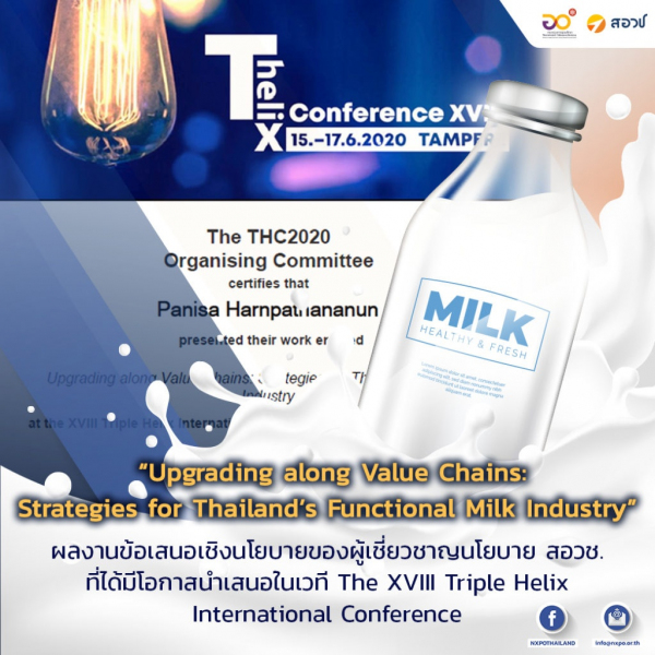 ผลงานของบุคลากร สอวช. คุณภาณิศา หาญพัฒนนันท์ ผู้เชี่ยวชาญนโยบาย สอวช. ที่ได้มีโอกาสนำเสนอผลงานข้อเสนอเชิงนโยบายเรื่อง Upgrading along Value Chains: Strategies for Thailand’s Functional Milk Industry ในการประชุม The XVIII Triple Helix International Conference เมื่อวันที่ 16 มิถุนายน 2563 ผ่าน ระบบออนไลน์ (Virtual Conference)