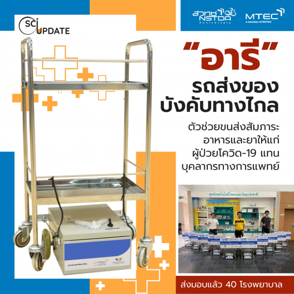 นวัตกรรม “อารี” รถส่งของบังคับทางไกล (Remote-controlled Cart) ซึ่งคิดค้นและพัฒนาโดยศูนย์เทคโนโลยีโลหะและวัสดุแห่งชาติ (เอ็มเทค) สำนักงานพัฒนาวิทยาศาสตร์และเทคโนโลยีแห่งชาติ (สวทช.) นับเป็นอีกหนึ่งตัวช่วยสำคัญที่สามารถใช้ขนส่งสัมภาระแทนบุคลากรทางการแพทย์ ซึ่งนอกจากจะช่วยลดภาระงาน ลดความเสี่ยง เลี่ยงการสัมผัสกับผู้ติดเชื้อโควิด-19 แล้ว ยังช่วยประหยัดค่าใช้จ่ายในส่วนของอุปกรณ์ป้องกันอันตรายส่วนบุคคล (Personal Protection Equipment; PPE) หรือ ชุดพีพีอี เพราะเมื่อเจ้าหน้าที่ใส่ปฏิบัติงานในหอผู้ป่วยเฉพาะกิจแล้วจะต้องกำจัดชุด PPE ทิ้งทันที