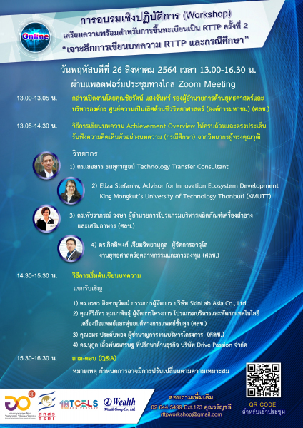 กระทรวงการอุดมศึกษาวิทยาศาสตร์ วิจัยและนวัตกรรม (อว.) โดย ศูนย์ความเป็นเลิศชีววิทยาศาสตร์ (องค์การมหาชน) หรือ ทีเซลส์ (TCELS) ฝ่ายยุทธศาสตร์อุตสาหกรรมและการลงทุน โดยได้รับการสนับสนุนจาก สำนักงานคณะกรรมการส่งเสริมวิทยาศาสตร์ วิจัยและนวัตกรรม (สกสว.) ร่วมจัดอบรมเชิงปฏิบัติการเตรียมความพร้อมสำหรับการขึ้นทะเบียนเป็น RTTP ครั้งที่ 2 หัวข้อ “เจาะลึกการเขียนบทความ RTTP และกรณีศึกษา” ร่วมเจาะลึกทุกเทคนิคที่ตอบโจทย์ความต้องการในการขึ้นทะเบียน RTTP ในวันพฤหัสบดีที่ 26 สิงหาคม 2564 เวลา 13.00-16.30 น. ผ่านแพลตฟอร์มประชุมทางไกล Zoom Meeting