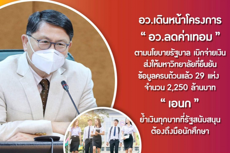 เมื่อวันที่ 30 สิงหาคม 2564 : ศาสตราจารย์พิเศษ ดร. เอนก เหล่าธรรมทัศน์ รัฐมนตรีว่าการกระทรวงการอุดมศึกษา วิทยาศาสตร์ วิจัยและนวัตกรรม (อว.) เปิดเผยว่า ตามที่คณะรัฐมนตรีได้อนุมัติให้ อว. ดำเนินโครงการลดภาระค่าใช้จ่ายด้านการศึกษาของนิสิตนักศึกษาในสถาบันอุดมศึกษาทั้งภาครัฐและเอกชน จากสถานการณ์การระบาดของโรคโควิด-19 นั้น ขณะนี้ อว. ได้เริ่มการเบิกจ่ายเงินสำหรับโครงการ "อว.ลดค่าเทอม" แล้วตั้งแต่วันที่ 26 สิงหาคม 2564 สำหรับมหาวิทยาลัยและสถาบันที่ได้จัดส่งข้อมูลผ่านการตรวจสอบและยืนยันความถูกต้อง เสนอมายัง อว. ครบถ้วนแล้ว จำนวน 29 แห่ง รวมเป็นเงิน 2,250 ล้านบาท ซึ่งมหาวิทยาลัย/สถาบันอุดมศึกษาจะนำไปใช้ลดค่าเทอมและค่าธรรมเนียมการศึกษาภาคเรียนที่ 1/2564 ในสัดส่วนเงินสนับสนุนจากรัฐบาลตามหลักเกณฑ์และวิธีการที่ได้แจ้งไปแล้ว โดยได้เน้นย้ำให้กระบวนการอนุมัติงบประมาณมีความรวดเร็ว รอบคอบ รัดกุม ขั้นตอนจ่ายเงินขอให้ดำเนินการด้วยความโปร่งใส สามารถติดตามตรวจสอบการจ่ายเงินทุกขั้นตอน ไม่ให้เกิดการทุจริตอย่างเด็ดขาด