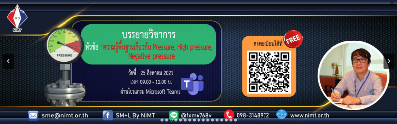 โครงการพัฒนาผู้ประกอบ สู่ไทยแลน์ 4.0 ด้วยเทคโนโลยีมาตรวิทยา SM+L จัดตั้งขึ้นโดยสถาบันมาตรวิทยาแห่งชาติ (มว.) เพื่อสนับสนุนผู้ประกอบการให้มีขีดความสามารถการแข่งขันสำหรับตลาดในประเทศ รวมทั้งสร้างความสามารถในการแข่งขันระดับสากล ผ่านการยกระดับคุณภาพของสินค้าและบริการ การเพิ่มผลิตภาพของผู้ประกอบการ และการเพิ่มผลิตภาพของแรงงาน จัดบรรยายวิชาการหัวข้อ “ความรู้พื้นฐานเกี่ยวกับ Pressure, High pressure, Negative pressure” โดยในวันนี้ดร.ปฎิพัทธ์ วงค์เทพ นักมาตรวิทยาชำนาญการ กลุ่มงานกลศาสตร์ของไหล ฝ่ายมาตรวิทยาเชิงกล ได้บรรยายในเรื่องทฤษฎีเบื้องต้นของความดัน เครื่องมือวัดความดัน เครื่องมือมาตรฐานของสถาบันมาตรวิทยาแห่งชาติ รวมถึงการวัดความดันย่านติดลบ และการวัดความดันย่านสูง  การบรรยายวิชาการดังกล่าวเป็นไปในแบบออนไลน์ ณ สถาบันมาตรวิทยาแห่งชาติ (มว.) จ.ปทุมธานี
