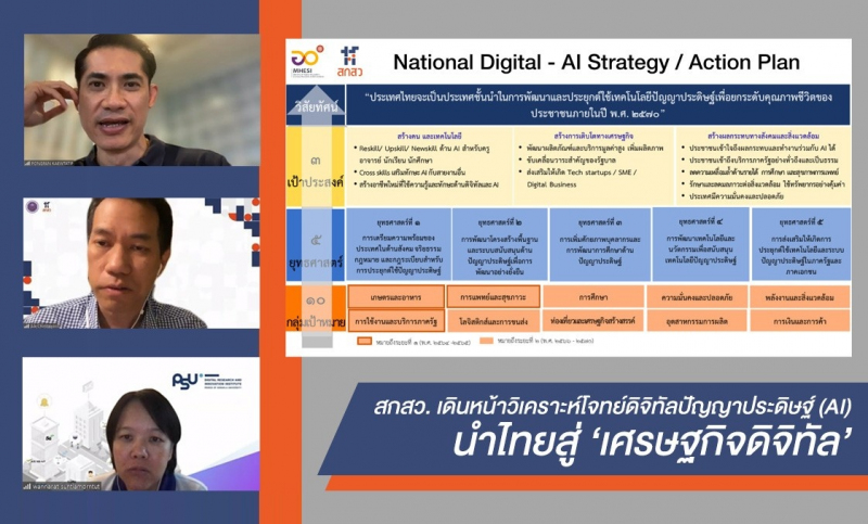 ผู้ช่วยศาสตราจารย์ ดร.วรรณรัช สันติอมรทัต ประธานหน่วยบูรณาการประเด็นเชิงยุทธศาสตร์ ววน. (SAT) ด้านดิจิทัลปัญญาประดิษฐ์ สกสว. ได้นำเสนอถึงผลการศึกษาโครงการ “การจัดการความรู้เพื่อพัฒนาระบบวิทยาศาสตร์ วิจัยและนวัตกรรม (ววน.) สาขาดิจิทัลปัญญาประดิษฐ์” โดยอธิบายว่า ปัจุบันโลกกำลังเข้าสู่ยุคการพัฒนาเทคโนโลยีดิจิทัลและปัญญาประดิษฐ์ (Artificial Intelligence; AI) ซึ่งปัจจุบัน AI เข้ามามีบทบาทในชีวิตประจำวันของมนุษย์มากยิ่งขึ้น โดยเฉพาะอย่างยิ่งในช่วงการแพร่ระบาดของโรคโควิด-19 มีการเร่งการพัฒนาและใช้ AI ในทุกภาคส่วน ซึ่งเห็นได้ชัดเจนอย่างยิ่งในภาคการเงิน เทคโนโลยีการสื่อสาร รวมถึงการแพทย์ โดยประเทศไทยมีแผนปฏิบัติการขับเคลื่อนระบบปัญญาประดิษฐ์เพื่อการพัฒนาประเทศ ซึ่งเป็นความร่วมมือระหว่าง กระทรวงการอุดมศึกษา วิทยาศาสตร์ วิจัยและนวัตกรรม (อว.) ร่วมกับ กระทรวงดิจิทัลเพื่อเศรษฐกิจและสังคม (DES) โดยในปี พ.ศ. 2565 มุ่งเน้นการขับเคลื่อน AI ในด้านการแพทย์ การเกษตร และการบริหารจัดการในภาครัฐ รวมถึงภาคการเงิน โดยข้อเสนอจากการศึกษาครั้งนี้มองไปถึงการสร้างความร่วมมือกับมหาวิทยาลัย ภาครัฐและเอกชน ร่วมกันเร่งพัฒนาการใช้ประโยชน์จากเอไอ
