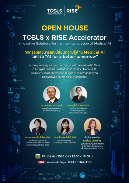 กระทรวงการอุดมศึกษา วิทยาศาสตร์ วิจัยและนวัตกรรม โดยศูนย์ความเป็นเลิศด้านชีววิทยาศาสตร์ (องค์การมหาชน) หรือ ทีเซลส์ (TCELS) จับมือร่วมกับ RISE สถาบันเร่งสปีดนวัตกรรมองค์กร จัดเสวนาแลกเปลี่ยนความรู้ด้าน Medical AI หัวข้อ “AI for a better tomorrow” โดย LIVE ผ่านทาง เฟซบุ๊กแฟนเพจ TCELS THAILAND วันอังคารที่ 25 ม.ค. 2565 เวลา13.00-15.00 น. พบกับผู้เชี่ยวชาญระดับแนวหน้าของประเทศด้าน Health Tech ที่จะมาพูดคุยแลกเปลี่ยนประสบการณ์ด้าน Medical AI และมองหาโอกาสใหม่ๆ ทางธุรกิจในอุตสาหกรรมทางการแพทย์และสุขภาพ ในประเทศไทยและภูมิภาคเอเซีย