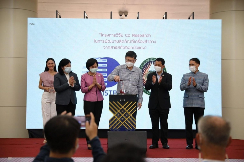 ศาสตราจารย์พิเศษ ดร.เอนก เหล่าธรรมทัศน์ รัฐมนตรีว่าการกระทรวงการอุดมศึกษา วิทยาศาสตร์ วิจัยและนวัตกรรม เป็นประธานเปิดตัว “ผลงานวิจัยและพัฒนาเครื่องสำอางจากดอกบัวแดง” ภายใต้ความร่วมมือระหว่าง สถาบันวิจัยวิทยาศาสตร์และเทคโนโลยีแห่งประเทศไทย (วว.) และมหาวิทยาลัยราชภัฏอุดรธานี โอกาสนี้ ศ.ดร.นพ.สิริฤกษ์ ทรงศิวิไล ปลัดกระทรวง อว. ศ.(วิจัย) ดร.ชุติมา เอี่ยมโชติชวลิต ผู้ว่าการ วว. ผศ.ดร.คณิศรา ธัญสุนทรสกุล อธิการบดีมหาวิทยาลัยราชภัฏอุดรธานี พร้อมด้วยคณะผู้บริหารกระทรวง อว. ส่วนราชการจังหวัดอุดรธานี รวมทั้งหน่วยงานภาครัฐและภาคเอกชน ในจังหวัดอุดรธานี ร่วมเป็นเกียรติในพิธี ในวันอาทิตย์ที่ 27 มี.ค.65 ณ มหาวิทยาลัยราชภัฏอุดรธานี ศูนย์การศึกษาสามพร้าว อ.เมือง จ.อุดรธานี