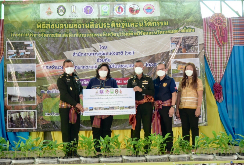 ดร.วิภารัตน์ ดีอ่อง ผู้อำนวยการสำนักงานการวิจัยแห่งชาติ กล่าวว่า วช. ภายใต้กระทรวง อว. เล็งเห็นถึงความร่วมมือระหว่างภาคการวิจัยและภาคความมั่นคง ในการเชื่อมต่องานวิจัยและนวัตกรรมเพื่อการแก้ไขปัญหาให้ภาคประชาชน ซึ่งเป็นความร่วมมือระหว่าง วช. และ กอ.รมน. ในการใช้ประโยชน์องค์ความรู้จากผลงานวิจัยและนวัตกรรมเพื่อการพัฒนาเชิงพื้นที่ ตามแนวคิด “ชุมชนเข้มแข็ง ด้วยวิจัยและนวัตกรรม” ซึ่งจะเป็นการส่งมอบผลงานวิจัยและนวัตกรรมในโครงการเรื่อง “การบริหารจัดการภัยแล้งพื้นที่เกษตรกรรมจังหวัดบุรีรัมย์ด้วยวิจัยและนวัตกรรมอย่างยั่งยืน” โดย วช. ได้ให้การสนับสนุนองค์ความรู้ เทคโนโลยี นวัตกรรมเพื่อการบริหารจัดการภัยแล้งพื้นที่เกษตรกรรม ผ่าน 4 กิจกรรมหลัก 12 นวัตกรรม ที่พัฒนาโดยทีมคณะนักวิจัยจากมหาวิทยาลัยมหาสารคาม ร่วมกับ มหาวิทยาลัยราชภัฏสุรินทร์ และมหาวิทยาลัยเทคโนโลยีราชมงคลอีสาน วิทยาเขตสุรินทร์ เพื่อการเพิ่มประสิทธิภาพในกระบวนการผลิต การยกระดับคุณภาพชีวิตของเกษตรกรและประชาชนในพื้นที่ตำบลชุมแสง อำเภอสตึก จังหวัดบุรีรัมย์ให้สูงขึ้น และที่สำคัญยิ่งคือ ความร่วมมือร่วมใจของพี่น้องชาวตำบลชุมแสงและพื้นที่ข้างเคียง ตลอดจน กำนัน ผู้ใหญ่บ้าน ผู้นำชุมชน ปราชญ์ชาวบ้าน ปราชญ์ชุมชน ที่ร่วมมือกันจนสำเร็จลุล่วงไปได้ด้วยดี