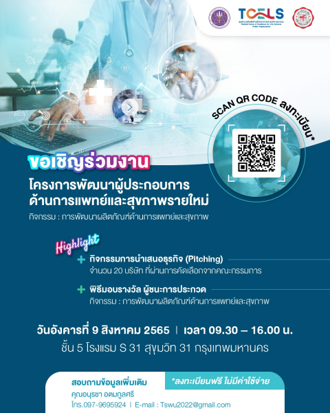 กระทรวงการอุดมศึกษาวิทยาศาสตร์ วิจัยและนวัตกรรม (อว.) โดย ศูนย์ความเป็นเลิศชีววิทยาศาสตร์ (องค์การมหาชน) หรือ ทีเซลส์ (TCELS) ร่วมกับ มหาวิทยาลัยศรีนครินทรวิโรฒ (มศว) ขอเชิญชวนนักลงทุน นักวิจัย ผู้ประกอบการ และผู้สนใจ เข้าร่วมงาน โครงการพัฒนาผู้ประกอบการด้านการแพทย์และสุขภาพรายใหม่ ในวันอังคารที่ 9 สิงหาคม 2565 เวลา 09.30–16.00 น. ณ ชั้น 5 โรงแรม S31 สุขุมวิท 31 กรุงเทพมหานคร