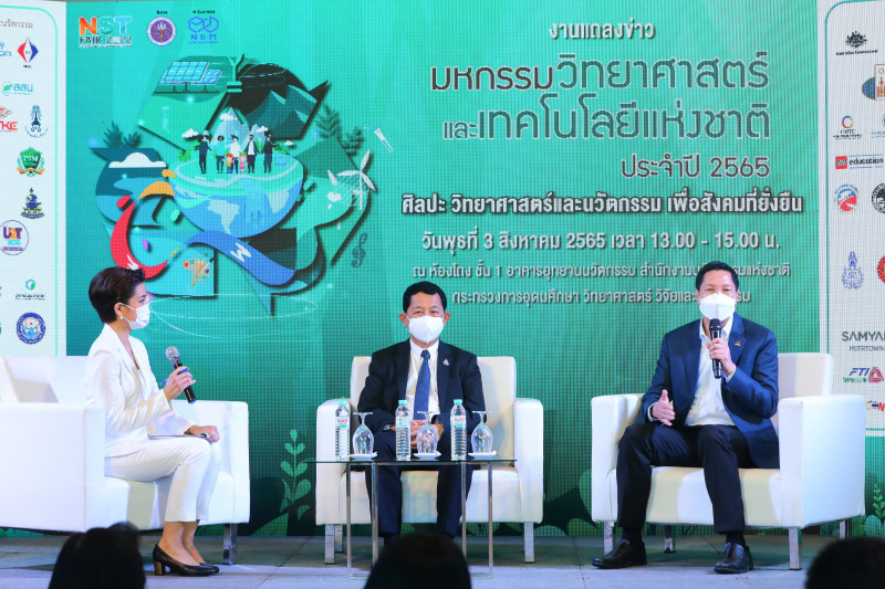 เมื่อวันที่ 3 ส.ค. 2565 ศ. (พิเศษ) ดร.เอนก เหล่าธรรมทรรศน์ รัฐมนตรีว่าการกระทรวงการอุดมศึกษา วิทยาศาสตร์ วิจัยและนวัตกรรม (รมว.อว.) พร้อมด้วย ศ.ดร.นพ.สิริฤกษ์ ทรงศิวิไล ปลัดกระทรวงการอุดมศึกษา วิทยาศาสตร์ วิจัยและนวัตกรรม (ปอว.) คณะผู้บริหาร อว. และ ผศ.ดร.รวิน ระวิวงศ์ ผู้อำนวยการองค์การพิพิธภัณฑ์วิทยาศาสตร์แห่งชาติ (ผอ.อพวช.) ร่วมเปิดงานแถลงข่าวการจัดงานมหกรรมวิทยาศาสตร์และเทคโนโลยีแห่งชาติ ประจำปีที่ 2565 ภายใต้แนวคิดศิลปะ วิทยาศาสตร์และนวัตกรรม เพื่อสังคมที่ยั่งยืน ณ ห้องโถง ชั้น 1 อาคารอุทยานนวัตกรรม สำนักงานนวัตกรรมแห่งชาติ กระทรวงการอุดมศึกษา วิทยาศาสตร์ วิจัยและนวัตกรรม  ซึ่งไฮไลท์ภายในงานจะแสดงนวัตกรรมและผลงานวิทยาศาสตร์ที่ยิ่งใหญ่แห่งปี อาทิ นิทรรศการแก้วเปลี่ยนโลก (Through the Looking Glass) และนิทรรศการ ลอดช่อง ส่องถ้ำ (Cave and Karst) โดยจัดขึ้นในวันที่ 13 – 21 สิงหาคม 2565 ณ อาคาร 9 – 10  ศูนย์แสดงสินค้าและการประชุมอิมแพ็ค เมืองทองธานี และวันที่ 17 – 21 สิงหาคม 2565 ณ สามย่านมิตรทาวน์ กับงาน NST Fair Science Carnival Bangkok
