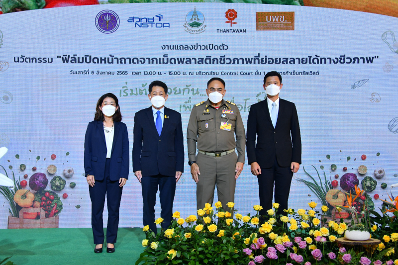 (วันที่ 6 สิงหาคม 2565) ณ บริเวณโซน เซ็นทรัล คอร์ต (Central Court) ชั้น 1 ศูนย์การค้าเซ็นทรัลเวิลด์ ราชประสงค์ กรุงเทพฯ : ดร.ณรงค์ ศิริเลิศวรกุล ผู้อำนวยการสำนักงานพัฒนาวิทยาศาสตร์และเทคโนโลยีแห่งชาติ (สวทช.) แถลงข่าวเปิดตัวนวัตกรรม ‘ฟิล์มปิดหน้าถาดจากเม็ดพลาสติกชีวภาพที่ย่อยสลายได้ทางชีวภาพ’ เริ่มต้นด้วยกันเพื่อเราเพื่อโลก โดยมี พลเอก กัมปนาท รุดดิษฐ์ ประธานกรรมการบริหารมูลนิธิโครงการหลวง ศ.ดร.อาภาณี เหลืองนฤมิตชัย ประธานอนุกรรมการแผนงานกลุ่มพลังงาน เคมีและวัสดุชีวภาพ หน่วยบริหารและจัดการทุนด้านการเพิ่มความสามารถในการแข่งขันของประเทศ (บพข.) และนายเดชบดินทร์ เหรียญทรัพย์ดี รองประธานเจ้าหน้าที่บริหาร บริษัท ทานตะวันอุตสาหกรรม จำกัด (มหาชน) ร่วมแถลงข่าว ซึ่งภายในงานมีการเปิดตัว ฟิล์มปิดหน้าถาดจากเม็ดพลาสติกชีวภาพที่ย่อยสลายได้ทางชีวภาพที่นำไปบรรจุผักสลัดพร้อมทานของมูลนิธิโครงการหลวง วางจำหน่ายให้ประชาชนที่เข้ามาซื้อผลิตภัณฑ์คุณภาพระดับพรีเมียม สินค้าผลผลิตทางการเกษตร ที่ปลูกโดยชาวเขาบนพื้นที่สูงภายในงานโครงการหลวง 53 (Royal Project 53) ซึ่งมูลนิธิโครงการหลวงและพันธมิตรจัดขึ้นระหว่างวันที่ 4-14 สิงหาคม 2565 นี้