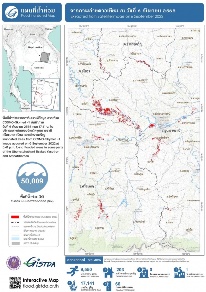 GISTDA ใช้ดาวเทียม Cosmo-SkyMed-1 วันที่ 6 กันยายน 2565 ติดตามสถานการณ์น้ำท่วมในเขตภาคตะวันออกเฉียงเหนือ ล่าสุดพบพื้นที่น้ำท่วมขังแล้วจำนวน 50,009 ไร่ ในบริเวณบางส่วนของจังหวัด #อุบลราชธานี 29,190 ไร่ #ศรีสะเกษ 12,522 ไร่#ยโสธร 6,086 ไร่ #อำนาจเจริญ 2,211 ไร่