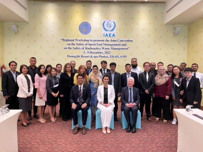 สำนักงานปรมาณูเพื่อสันติ (ปส.) กระทรวงการอุดมศึกษา วิทยาศาสตร์ วิจัยและนวัตกรรม (อว.) ร่วมกับทบวงการพลังงานปรมาณูระหว่างประเทศ (International Atomic Energy Agency; IAEA) จัดการประชุมเชิงปฏิบัติการหลักสูตร Regional Workshop to Promote the Joint Convention on the Safety of Spent Fuel Management and on the Safety of Radioactive Waste Management ตั้งแต่วันที่ 5 – 9 ธันวาคม 2565 ณ โรงแรมดวงจิตต์ รีสอร์ท แอนด์ สปา จังหวัดภูเก็ต โดยมีผู้เข้าร่วมการฝึกอบรมประมาณ 30 คน                    จากประเทศต่าง ๆ  ในภูมิภาคเอเชียจำนวน 7 ประเทศ ได้แก่ บังคลาเทศ มาเลเซีย เนปาล ปากีสถาน ฟิลิปปินส์ ศรีลังกา และประเทศไทย โดยทุกประเทศที่เข้าร่วมการฝึกอบรมนอกจากประเทศไทย ล้วนเป็นประเทศที่ยังไม่ได้เข้าร่วมเป็นภาคีอนุสัญญาร่วมว่าด้วยความปลอดภัยของการจัดการเชื้อเพลิงที่ใช้แล้ว และความปลอดภัยของการจัดการกากกัมมันตภาพรังสี (Joint Convention on the Safety of Spent Fuel Management and on the Safety of Radioactive Waste Management) ซึ่งการอบรมในครั้งนี้ได้รับการสนับสนุนวิทยากรผู้มีความเชี่ยวชาญจาก IAEA โดยมีวัตถุประสงค์เพื่อสนับสนุนและส่งเสริมให้ประเทศในภูมิภาคเอเชียเข้าร่วมเป็นภาคีอนุสัญญาฯ ดังกล่าว และการฝึกอบรมนี้ IAEA ได้เล็งเห็นความสำคัญของประเทศไทยซึ่งเป็นตัวอย่างที่ดีในฐานะเป็นหนึ่งในประเทศภาคีอนุสัญญาฯ ที่จะมีส่วนช่วยสร้างความรู้ความเข้าใจตลอดจนการตัดสินใจเข้าร่วมภาคีอนุสัญญาฯ อันจะเป็นการส่งเสริมให้เกิดความปลอดภัยในการจัดการเชื้อเพลิงนิวเคลียร์ใช้แล้วและความปลอดภัยของการจัดการกากกัมมันตภาพรังสีให้ดียิ่งขึ้นตามมาตรฐานสากลต่อไป